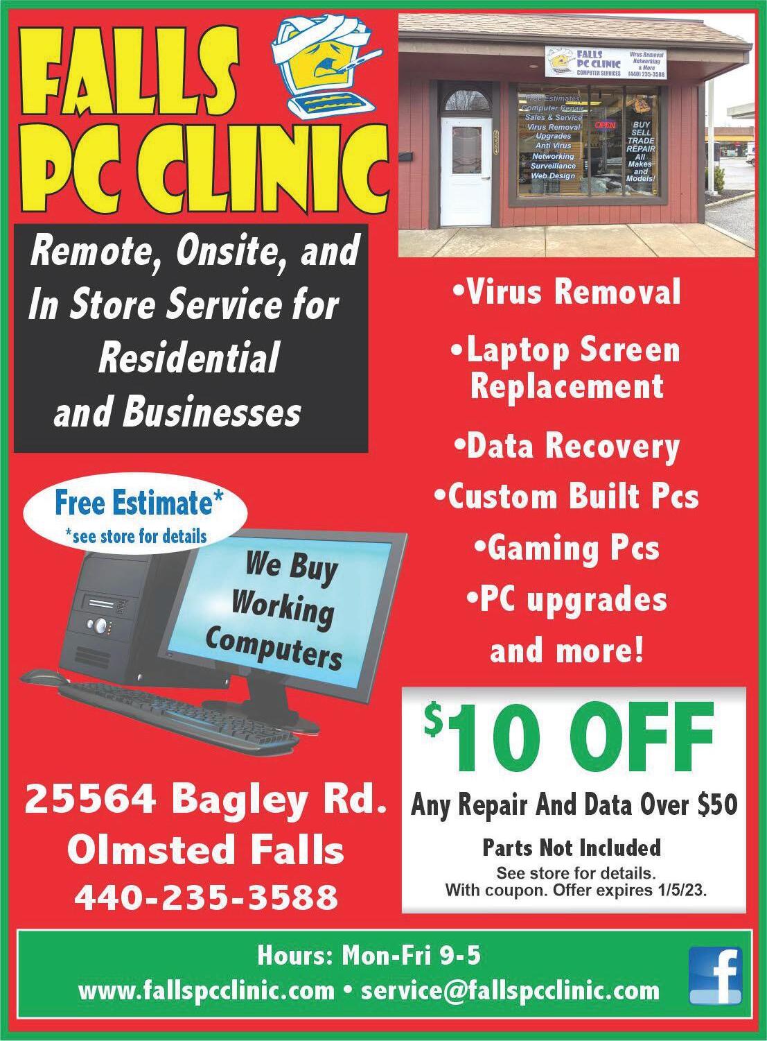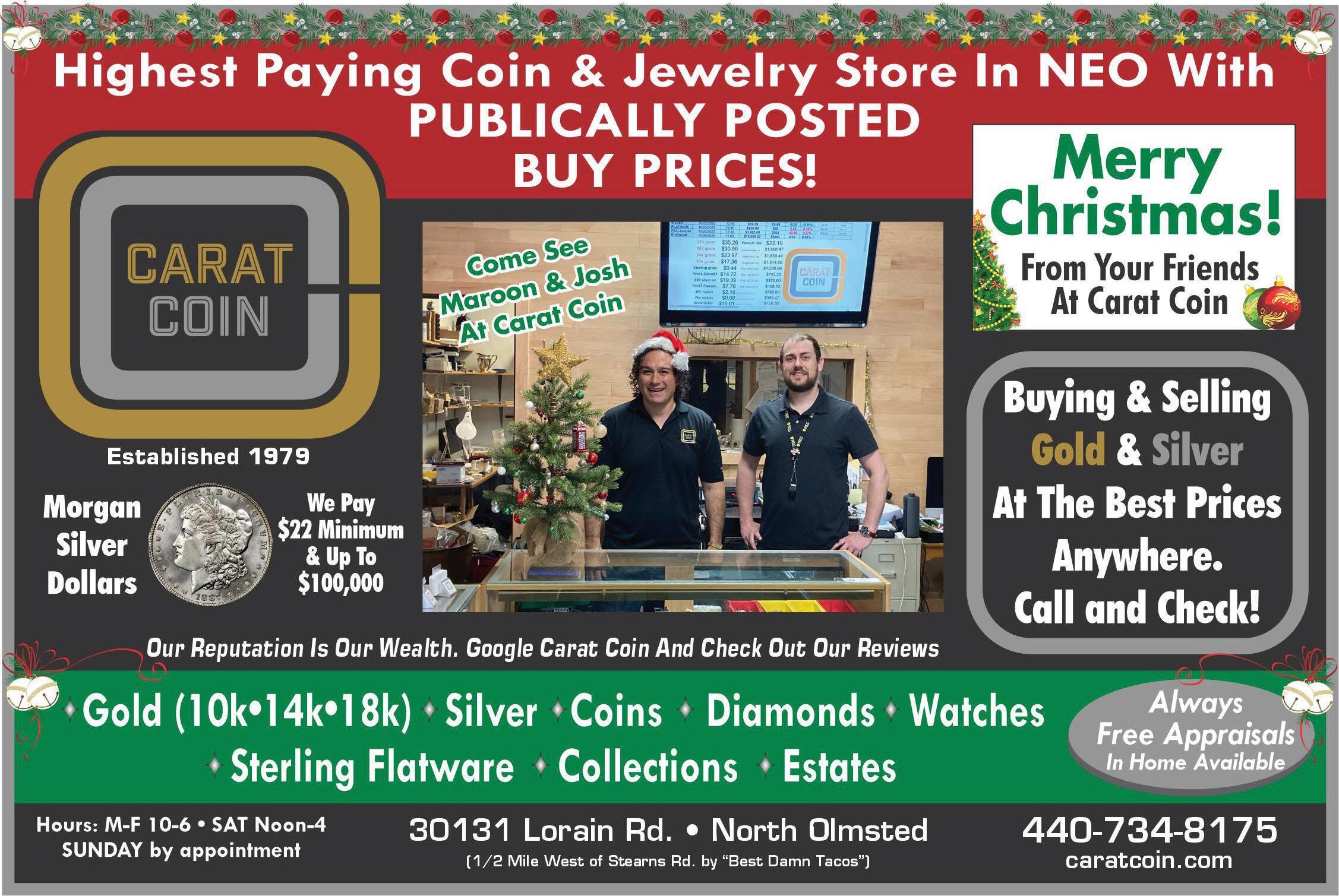 KNAPPSAUTOTOW.COM 7223 Stearns Rd.•Olmsted Twp. (1/4 mile South of I-480) 440.235.1127 CALL ROB FOR A FREE ESTIMATE! Email: Knappsautoolmsted@gmail.com SAME DAY SERVICE AVAILABLE Two Year 24,000 Warranty HOURS M-F 8-5 Locally Owned & Operated by Olmsted Falls Grads! Complete Winter Safety Inspection WithFREE Battery Check With Any Repair Oil Change $ 39 .95 $ 59 .95 Some Restrictions may apply. With coupon. Expires1-5-23. Some Restrictions may apply. With coupon. Expires1-5-23. 5% Discount For AAA Members Loaner Cars Synthetic Blend Full Synthetic Includes up to 5qts New FilterLube & Some restrictions may apply. Not valid on other specials or discounts. Not valid on tires or batteries. Wth coupon. Expires 1. -5-23 Ask About FREE TWith Repairs OWING SANTASPECIAL BRAKES 15% OFF Any service over $150 33009 Lorain Rd.•North Ridgeville 440-309-4999 Pickup & Delivery Available Open 7 Days A Week Full Lunch & Dinner Menu Happy Holidays From Your Friends At Pizza Pan Near Turnpike Gift Certificates Available 2 Topping Half Sheet Pizza Large Cheesy Bread & Two Liter $99 21 Family Fun Night Special Order Online orderpizzapan.com Must present coupon. Not valid with other offers, specials or promotions. Expires 1-. 5-23 Only valid at North Ridgeville location. Subs • Wings • Appetizers • Ribs Must present coupon. Not valid with other offers, specials or promotions. Expires 1-. 5-23 Only valid at North Ridgeville location. Must present coupon. Not valid with other offers, specials or promotions. Expires 1-. 5-23 Only valid at North Ridgeville location. Offer Expires 1-. 5-23 Pizza•Calzones •Stromboli • Salads•Cheesy Bread Sticks $99 12 One Slab of Ribs $99 5No Limit $2199 Jumbo Topping Pizza 2 Plus One Pound of Wings Lunch Special Any Small Pizza with up to 3 toppings (1am-pm only) 02 Limit 5 8089 COLUMBIA ROAD Olmsted Falls Across from Grand Pacific Junction Next to the Falls Restaurant 440-235-5000 KEITH JEWELERS Family Owned Since 1943 Affordable Gifts As Low As $20 Custom Handmade Rings Estate Jewelry•Best Prices Don’t Get Your Tinsel In A Tangle Quality, Selection & Value Without The Mall Madness! $5.00 WATCH BATTERY INSTALLED KEITH JEWELERS Most watches. With coupon. Expires 1-5-23 QUALITY JEWELRY REPAIR Shop Local This Holiday Season. Support Local Businesses That Support The Community! HOURS: TUE-FRI 10-6 SAT 10-3•SUN & MON CLOSED Sadie Says “Don’t Pay MallPrices!”