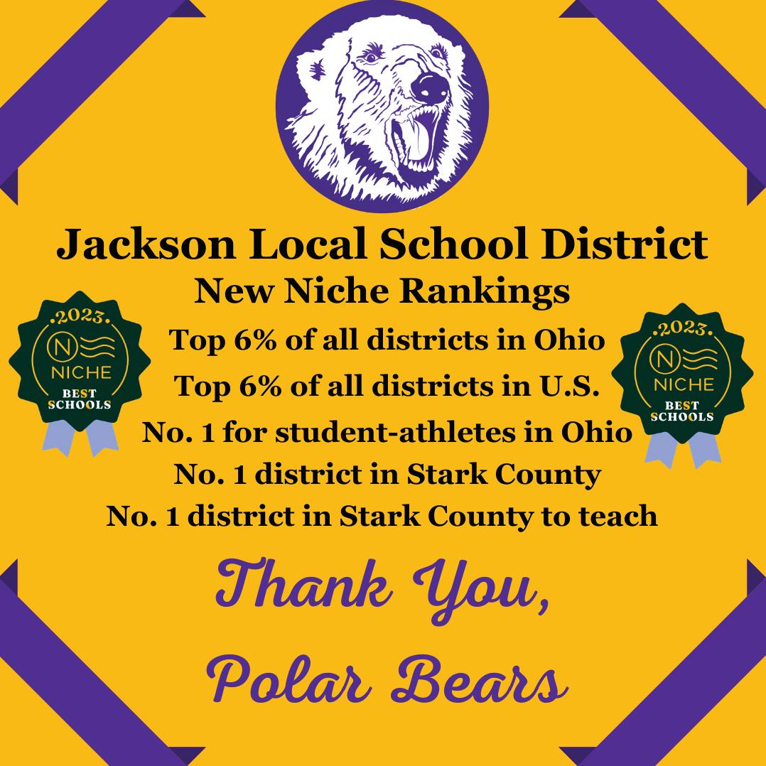 New Niche rankings have moved Jackson Local School District up among the best districts in Ohio and named us the No. 1 district in Ohio for student-athletes Way to go Polar Bears! And thank you to our extended Jackson community for your support always.