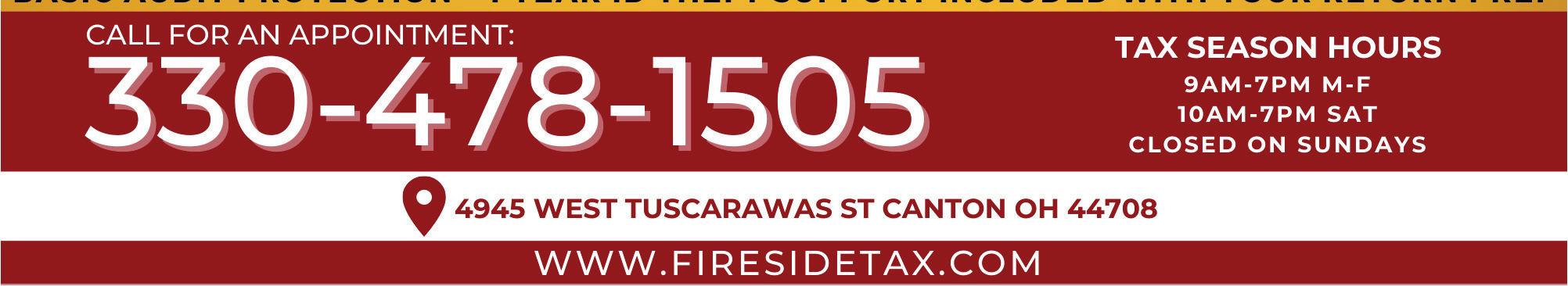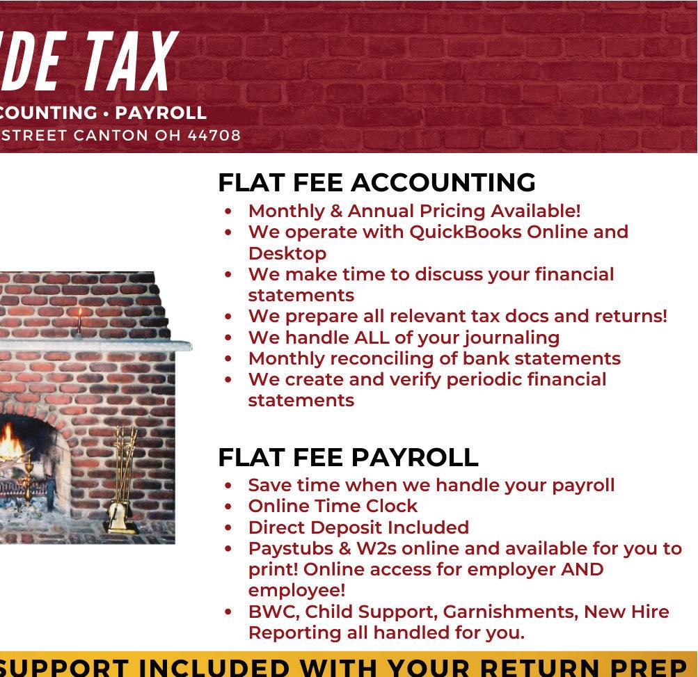 GARAGE DOOR REPAIR & INSTALL CALL TODAY! 330.265.0336 24/7 SERVICE! NO CHARGE FOR NIGHT CALLS! Must present coupon at time of repair. Expires 9/30/22 Must present coupon at time of repair. Expires 9/30/22 Must present coupon at time of repair. Expires 9/30/22 Must present coupon at time of repair. Expires 9/30/22 ONE HIGHCYCLE SPRING WITH PURCHASE OF ONE HIGH CYCLE SPRING AT REGULAR PRICE $75 OFF $150 OFF $4500 $300 OFF SINGLE DOOR INSTALLATION TUNEUP SPECIAL DOUBLE DOOR INSTALLATION At Fireside Tax, REAL Accountants work on your taxes for LESS than what the major chains are charging! STOP OVERPAYING & UPGRADE to Fireside Tax for a much more professional service! PROFESSIONAL TAX PREP SERVICES