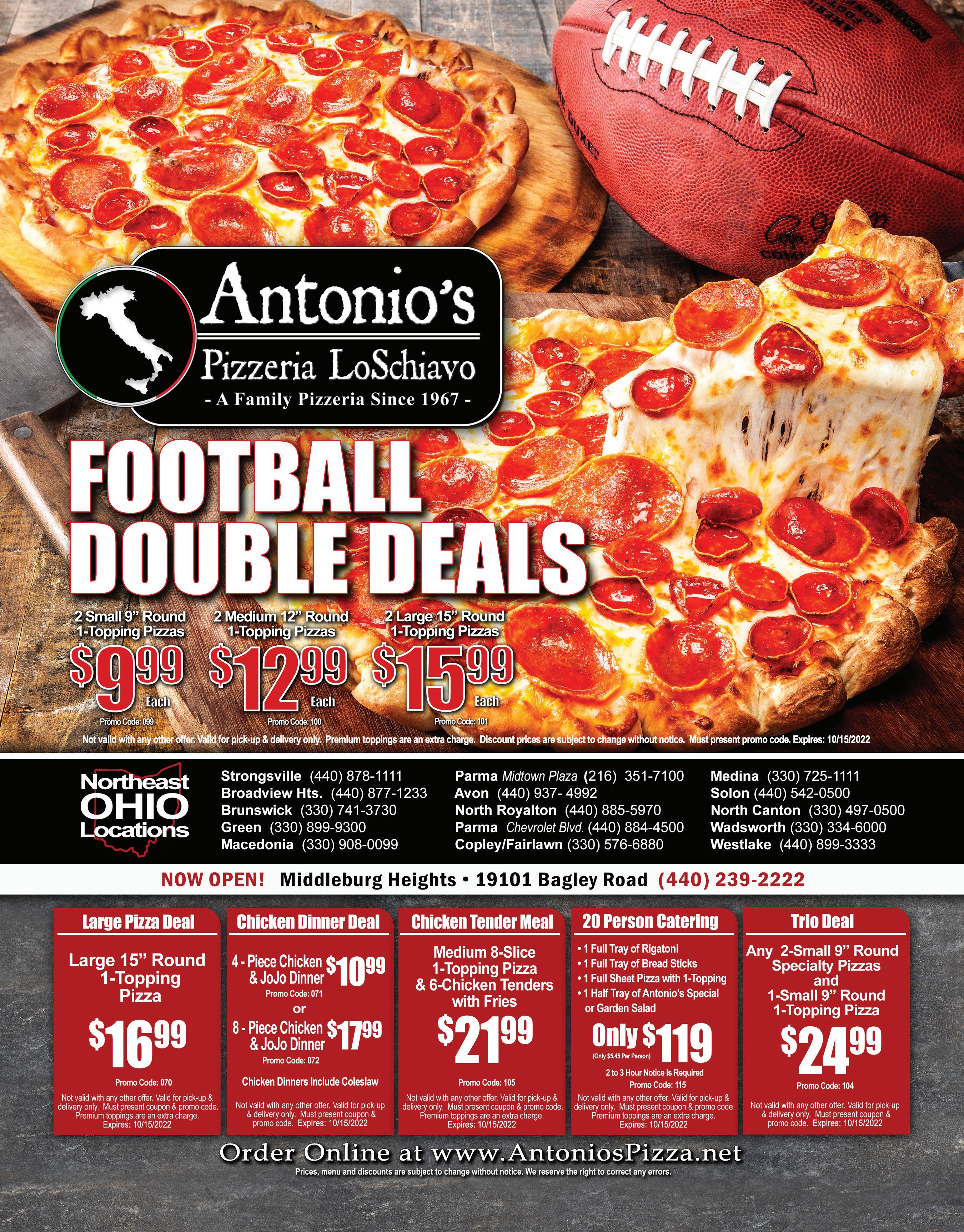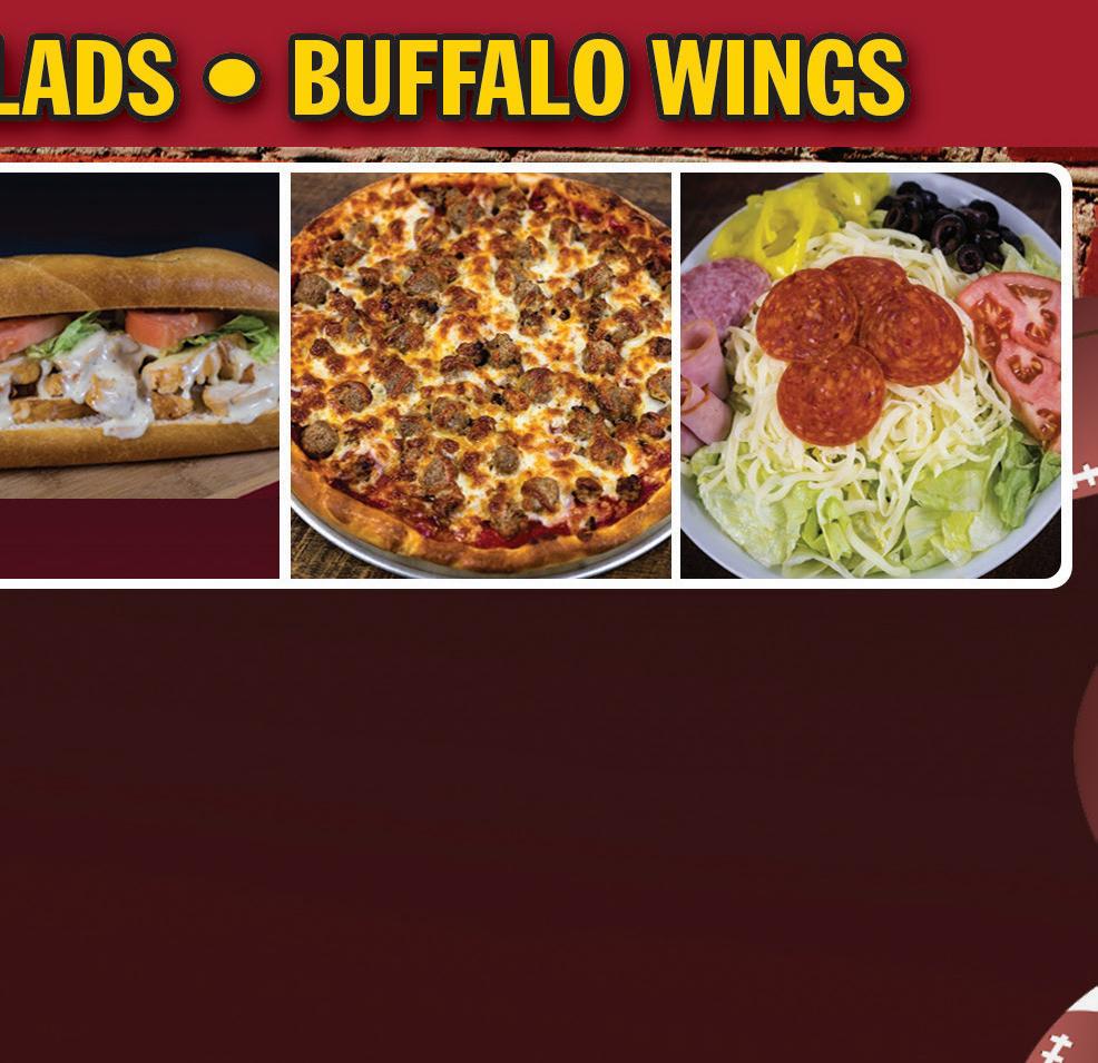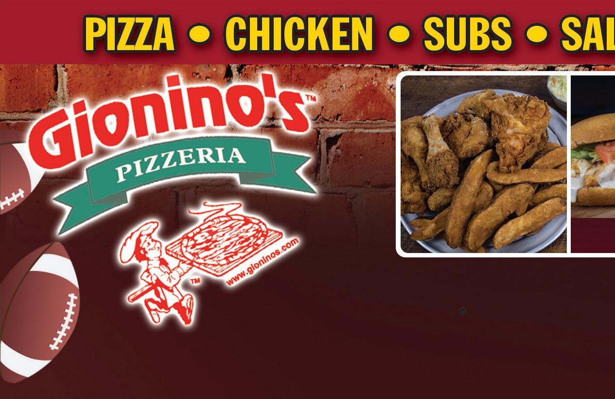 330.498.9999 5288 Fulton Drive NW Jackson-Lake Cable ORDERONLINE-QUICK,EASY&CONVENIENT www.ordergioninos.com GIONINO’S PIZZERIA Additional items $1.60, extra cheese $2.75. Coupon expires 9-29-22. Not valid with any other offer. Valid only at Jackson location. TMS GIONINO’S PIZZERIA - Additional items $2.00, extra cheese $3.20. Coupon expires 9-29-22. Not valid with any other offer. Valid only at Jackson location. TMS GIONINO’S PIZZERIA Additional items $2.00, extra cheese $3.20. Coupon expires 9-29-22. Not valid with any other offer. Valid only at Jackson location. TMS Buy Any Large Specialty Pizza Receive Small Gionino Bread FREE 1 Medium 12” 2-Item Pizza Only $1095 1 Large 16” 2-Item Pizza Only $1395 1 Party Pizza & 12 Wings with 1 Item Only $4395 2 Large 16” 2-Item Pizzas Only $2995 GIONINO’S PIZZERIA Additional items $2.00, extra cheese $3.20. Coupon expires 9-29-22. Not valid with any other offer. Valid only at Jackson location. TMS Family Feast Large 16” 1-Item Pizza, 8pc. Chicken & JoJo’s & Pint of Cole Slaw Only $3095 GIONINO’S PIZZERIA Additional items $1.60, extra cheese $2.75. Coupon expires 9-29-22. Not valid with any other offer. Valid only at Jackson location. TMS GIONINO’S PIZZERIA - Additional items $2.00, extra cheese $3.20. Coupon expires 9-29-22. Not valid with any other offer. Valid only at Jackson location. TMS 2 Medium 12” Pizzas Up to 2 Items Only $1795 GIONINO’S PIZZERIA - Additional items $2.00, extra cheese $3.20. Coupon expires 9-29-22. Not valid with any other offer. Valid only at Jackson location. TMS GIONINO’S PIZZERIA - Additional items $1.60, extra cheese $2.75. Coupon expires 9-29-22. Not valid with any other offer. Valid only at Jackson location. TMS 1 Large 16” 1-Item Pizza & 12 Wings Only $2595 Extra Cheese is not included as an item. You must request Daily Special when order is placed. ANY DAY OF THE WEEK! DAILY SPECIALS Medium Mania Medium 1-Item $8.75 Quick Combo Large 1-Item & Monday-Thursday 11am-10pm Friday-Saturday 11am-11pm Sunday 11am-10pm Delivery Available $8 Minimum Order to all of Jackson & Lake Cable Limited Area - Delivery Charge May Apply Local advertising made easy. Attract repeat customers. Grow your business. EFFECTIVE | AFFORDABLE | CONVENIENT | TARGETED Contact Mike for more information. 330.309.6953 | mikerogers@townmoneysaver.com