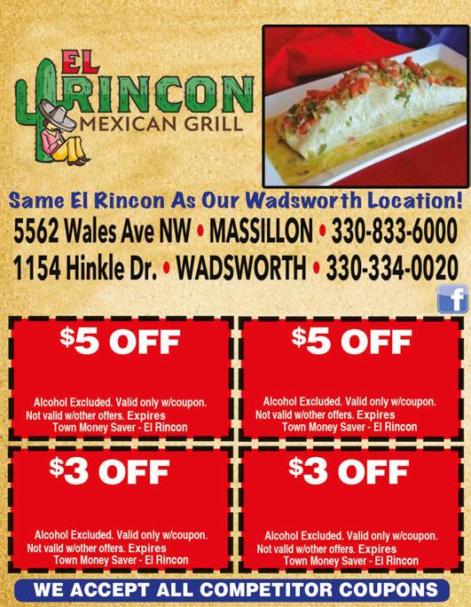 TLAQUEPAQUEMEXREST.COM NOW DELIVERING THROUGH DOORDASH ➔ 4460 Dressler Rd. Next to Post Office 330-649-9109 Check Out Our Digital Menu & Weekly Offers! Mon, Tues, Wed, Thurs & Sun 11am - 10pm Fri. & Sat. 11am - 11pm TLAQUEPAQUE Authentic Mexican Food $5 OFF Any $25 Purchase Only (1) coupon per table. Excludes alcohol. Not valid with other offers. Expires 6/1/24. TOWN MONEY SAVER TLAQUEPAQUE Authentic Mexican Food $3 OFF Any $15 Purchase Only (1) coupon per table. Excludes alcohol. Not valid with other offers. Expires 6/1/24. TOWN MONEY SAVER TLAQUEPAQUE Authentic Mexican Food $3 OFF Any $15 Purchase Only (1) coupon per table. Excludes alcohol. Not valid with other offers. Expires 6/1/24. TOWN MONEY SAVER Gift Cards Available! 4262 Portage St North-West Canton 330-526-6683 3 Locations to Serve you! 2682 Easton St. North-East Canton 234-458-8008 TLAQUEPAQUE AUTHENTIC MEXICAN FOOD TLAQUEPAQUE Authentic Mexican Food $5 OFF Any $25 Purchase Only (1) coupon per table. Excludes alcohol. Not valid with other offers. Expires 6/1/24. TOWN MONEY SAVER PATIO IS Now Open! KEEPING YOUR WATER FLOWING SINCE 1998 24/7 PLUMBING SERVICE! www.prestige.plumbing Prestige Plumbing, LLC Prestige Plumbing, LLC $ 25 OFF Any Performed Service Must present coupon. One coupon per person. Not valid with other o ers. GOOD FOR 2023 State Licensed Plumbing Company #14153 Wayne County – 330-828-8888 Stark County – 330-837-7777 Family Owned & Operated GOOD FOR 2024 Support LOCAL BUSINESSES like Town Money Saver to grow your community! Call Mike 330-309-6953 or email mikerogers@townmoneysaver.com JUNE ISSUE DEADLINE - MAY 15