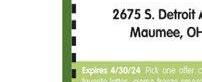 10% OFF Your Total Check the Briarfield Cafe With TMS coupon. Dine-in only. One coupon per check. Not valid with other offers, or on holidays, or with any other specials. Expires 4/30/24 breakfast coupon 10% OFF Your Total Check the Briarfield Cafe With TMS coupon. Dine-in only. One coupon per check. Not valid with other offers, or on holidays, or with any other specials. Expires 4/30/24 10% OFF Your Total Check the Briarfield Cafe With TMS coupon. Dine-in only. One coupon per check. Not valid with other offers, or on holidays, or with any other specials. Expires 4/30/24 lunch coupon dinner coupon $525 2 Eggs, Potatoes, Toast & Coffee Mon-Fri 7-10am Not valid with other coupons. Breakfast Special Breakfast • Lunch • Dinner Briarfield Café t h e Breakfast Served Dine-In & Carry Out 3220 Briarfield Blvd. Maumee 419.865.7260 www.briarfieldcafe.com All you can eat! Friday Fish Fry Alaskan Pollock (fried or broiled) $13 99 Choice of potato & soup or salad Not valid with other coupons. Closed EASTER SUNDAY OPEN 7AM 7 Days A Week! Spring is Here! Best time for SaladsBest Salads Around! We remove dangerous trip hazards & negative drainage DUE TO SUNKEN CONCRETE SURFACES on: Patios, Garage Floors, Sidewalks & Driveways CallPete! 10% OFF with this ad 419-351-4124 A+ MidwestConcreteLeveling.com Free Estimates We do Concrete POWERWASHING & SEALING! Sunken Concrete? Water Puddles Along Foundation? WE CAN HELP! Midwest Concrete Leveling & Sealing, LLC Maximum discount $200.00 Please present coupon at time of estimate. Not valid with other offers. Expires 4/30/24