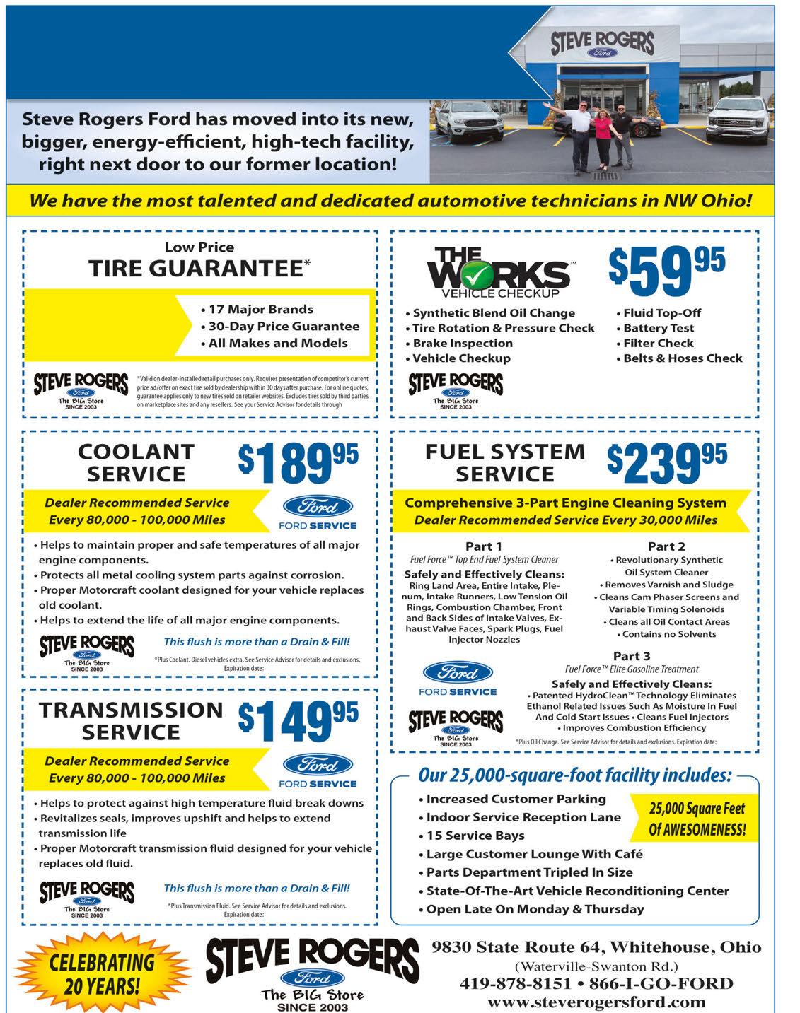 05/31/24. *Up to six quarts of MotocraftTM oil and Motocraft oil filter. Hybrid batter test excluded. See your Service Advisor for exclusions and details. $20.00 Maximum discount. Expiration date: 05/31/24. 05/31/24. 05/31/24. 05/31/24. Why Buy Tires Anywhere Else, When Steve Rogers Ford Offers All Of This: We Service All Lincoln Products Warranties, Recalls and Maintenance Service Appointments Available! From $5995 $19900 $27900 $19900 SERVICE HOURS: Mon. 7:30 a.m. - 7:00 p.m., Tues. 7:30 a.m. - 5:30 p.m., Wed. 7:30 a.m. - 5:30 p.m., Thurs. 7:30 a.m. - 7:00 p.m., Friday 7:30 a.m. - 5:30 p.m., Closed Sat. & Sun.