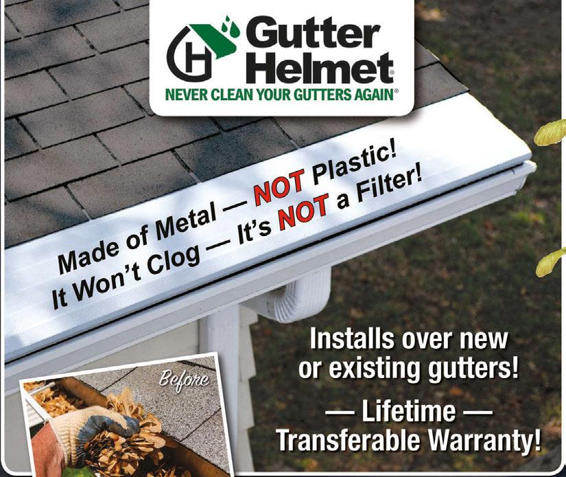 N E G L E C T I N G G U T T E R C L E A N I N G WIL L COST YOU Shield Your #1 Investment From Costly Water Damage $$$$ $$$$ $$$ $$$ HEAVING DRIVEWAY ROTTING FASCIA & SOFFIT FOUNDATION DAMAGE MOLD 15% Off 10 0% APR For 24 Months! ** Claim Your Discount Now! EXPIRES 07/31/2023 Seniors & Military **Wells Fargo Home Projects credit card is issued by Wells Fargo Bank, N.A., an Equal Housing Lender. Special terms for 24 mo. apply to qualifying purchases of $1,000 or more with approved credit. Minimum monthly payments will not pay off balance before end of promotional period. APR for new purchases is 28.99%. Effective: 01/01/2023 - subject to change. Call 1-800-431-5921 for complete details. + See Representative for full warranty details. *One coupon per household. No obligation estimate valid for 1 year. GET A FREE ESTIMATE TODAY! 1-844-440-9814 www.LeafFilter.com/damage | Promo Code: 37 % YOUR ENTIRE PURCHASE BEFORE AFTER The LeafFilter Advantage