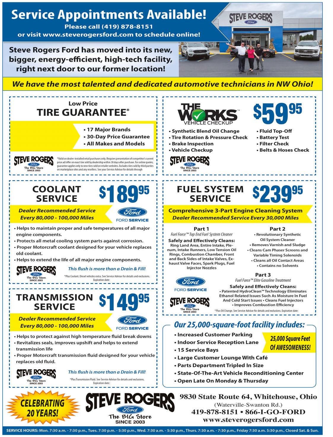 8/31/23 *Up to six quarts of MotocraftTM oil and Motocraft oil filter. Hybrid batter test excluded. See your Service Advisor for exclusions and details. $20.00 Maximum discount. Expiration date: 8/31/23 8/31/23 8/31/23 8/31/23 Why Buy Tires Anywhere Else, When Steve Rogers Ford Offers All Of This: