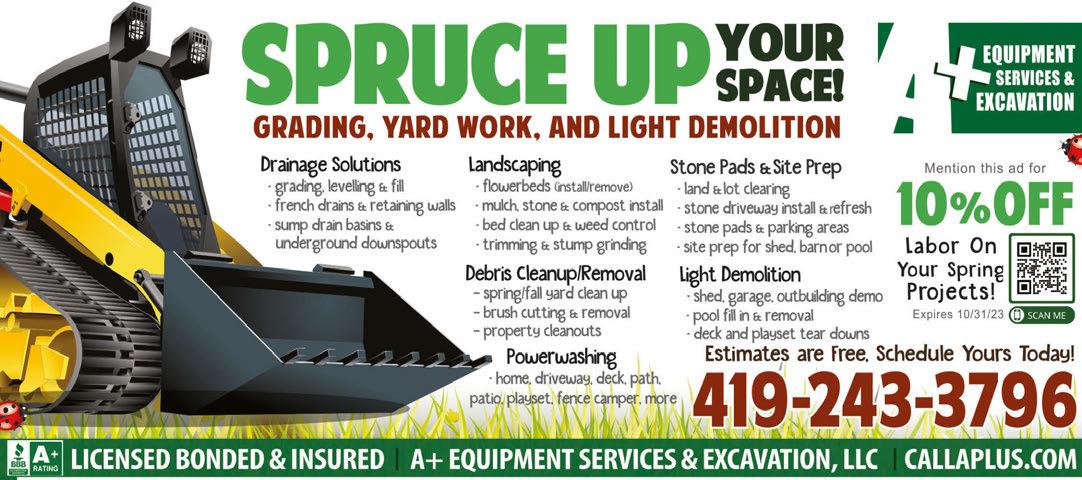 Includes 2 sides 11am-8pm EVERY FRIDAY All You Can Eat Fish Dinner Alaskan Pollock (includes 2 sides) Greek • Italian • Lebanese • American Cuisine FOR DELIVERY WE USE: DoorDash, Uber Eats, Grubhub & Order On The Way Since 1993 See our menu at: samsdinerofmaumee.com or on Facebook We Serve Breakfast All Day! Original Sam’s Diner. Mon-Fri 8am-11am. Not valid with any other offer. With TMS coupon. Exp. 7/31/23 578 W. Dussel, Maumee, Ohio 43537 419-897-0284 • Mon-Sat 8am-8pm • Sun 7am-3pm LUNCH & DINNER SPECIAL Original Sam’s Diner Not valid with any other offer. With TMS coupon. Exp. 7/31/23 20%OFFYOUR TOTAL BILL Senior Discounts (age 62 and up) $799 BREAKFAST SPECIALS 2 Eggs any style, homefries, toast, and choice of meat /Each 1/2 French Toast (2 pieces) OR 1/2 Pancake (2 pieces), plus 2 eggs any style or choice of meat Ham & Cheese Omelet, plus homefries & toast Any substitutions add $2.50 We have Cheesecake, Baklava, Lemon Meringue and Rice Pudding $1399 OPEN July 4th 8AM-3PM OPEN MENU GOD BLESS AMERICA! 1815 SYLVANIA AVE. • TOLEDO • 419-472-2040 AIR CONDITIONING • Central Air Conditioning • Mini-Split Air Conditioning RETAIL PARTS CENTER Appliance Parts • Air Conditioners • Boilers & Furnaces • Water Heaters FILTERS & HUMIDIFIERS • WATER HEATERS We Service All Brands Of Air Conditioners, Furnaces & Boilers Are you tired of that old furnace breaking down? A new high efficient gas furnace can save up to 40% on your gas bill. Call us today for your FREE ESTIMATE! HEATING • Gas Boilers • Gas & Electric Furnaces Complete Cleaning & Safety Inspection $119 A/C or Furnace One coupon per qualified purchase. Must present coupon at time of estimate. Not valid with any other offer. Exp. 7/31/23 SAVE $100 On a New A/C or Furnace One coupon per qualified purchase. Must present coupon at time of estimate. Not valid with any other offer. Exp. 7/31/23 SAVE $200 On a A/C AND Furnace One coupon per qualified purchase. Must present coupon at time of estimate. Not valid with any other offer. Exp. 7/31/23 We remove dangerous trip hazards & negative drainage DUE TO SUNKEN CONCRETE SURFACES on: Patios, Garage Floors, Sidewalks & Driveways CallPete! 10% OFF with this ad 419-351-4124 A+ MidwestConcreteLeveling.com Free Estimates We do Concrete POWERWASHING & SEALING! Sunken Concrete? Water Puddles Along Foundation? WE CAN HELP! Midwest Concrete Leveling & Sealing, LLC Maximum discount $200.00 Please present coupon at time of estimate. Not valid with other offers. Expires 7/31/23