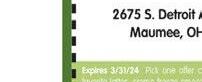 LUNCH & DINNER Grilled Sandwiches • Soups • Seafood Lobster Mac n’ Cheese One Appetizer OFF 1/2 With TMS coupon. Not valid with any any other coupon or offer. Exp. 3/31/24 312 SOUTH ST. • WATERVILLE 419-878-9105 • chowdersnmoor.com Hours: Mon - Sat 11am-10pm, Closed Sun www.donjuanandlosamigos.net Follow us on Facebook or Instagram for specials Also, join us at Franklin Park & Downtown $4 OFF Two Luncheon Specials Excludes Alcohol 20%OFF With TMS coupon. Not valid with any other offers or discounts. Exp. 3/31/24 MAU With TMS coupon. Not valid with any other offers or discounts. Exp. 3/31/24 MAU THE BESTMEXICAN CUISINE SCAN FOR FULL MENU MAUMEE 419-887-0700 551 W Dussel Dr HAPPY HOUR DAILY 3-6PM HALF OFF HOUSE MARGARITAS & ALL DRAFT BEER TACO TUESDAYS $1.99 HARD SHELL TACO (dine in only) THURSDAYS LADIES NIGHT (with DJ- Maumee location only) St. Patrick’s Day SUNDAY, MAR 17 1/2 OFF Nachos 1/2 OFF All Draft Beer 1/2 OFF Jumbo Lime Margaritas Beef, Chicken, Cheese & Beans Frozen or Rocks
