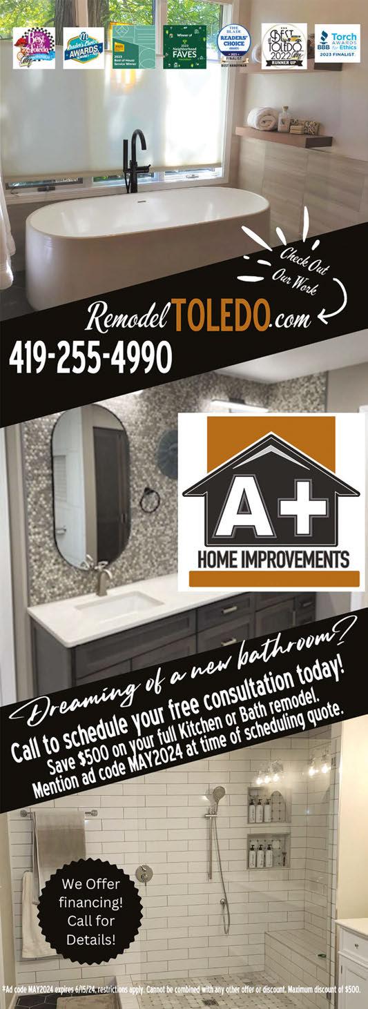 MOTHER’S Sun., May 12 7am-3pm 10% OFF Your Total Check the Briarfield Cafe With TMS coupon. Dine-in only. One coupon per check. Not valid with other offers, or on holidays, or with any other specials. Expires 5/31/24 breakfast coupon 10% OFF Your Total Check the Briarfield Cafe With TMS coupon. Dine-in only. One coupon per check. Not valid with other offers, or on holidays, or with any other specials. Expires 5/31/24 10% OFF Your Total Check the Briarfield Cafe With TMS coupon. Dine-in only. One coupon per check. Not valid with other offers, or on holidays, or with any other specials. Expires 5/31/24 lunch coupon dinner coupon $525 2 Eggs, Potatoes, Toast & Coffee Mon-Fri 7-10am Not valid with other coupons. Breakfast Special Breakfast • Lunch • Dinner Briarfield Café t h e Breakfast Served Dine-In & Carry Out 3220 Briarfield Blvd. Maumee 419.865.7260 www.briarfieldcafe.com All you can eat! Friday Fish Fry Alaskan Pollock (fried or broiled) $13 99 Choice of potato & soup or salad Not valid with other coupons. OPEN 7AM 7 Days A Week! IT’S OUR 20TH ANNIVERSARY Tuesday, May 7 CELEBRATE We remove dangerous trip hazards & negative drainage DUE TO SUNKEN CONCRETE SURFACES on: Patios, Garage Floors, Sidewalks & Driveways CallPete! 10% OFF with this ad 419-351-4124 A+ MidwestConcreteLeveling.com Free Estimates We do Concrete POWERWASHING & SEALING! Sunken Concrete? Water Puddles Along Foundation? WE CAN HELP! Midwest Concrete Leveling & Sealing, LLC Maximum discount $200.00 Please present coupon at time of estimate. Not valid with other offers. Expires 5/31/24