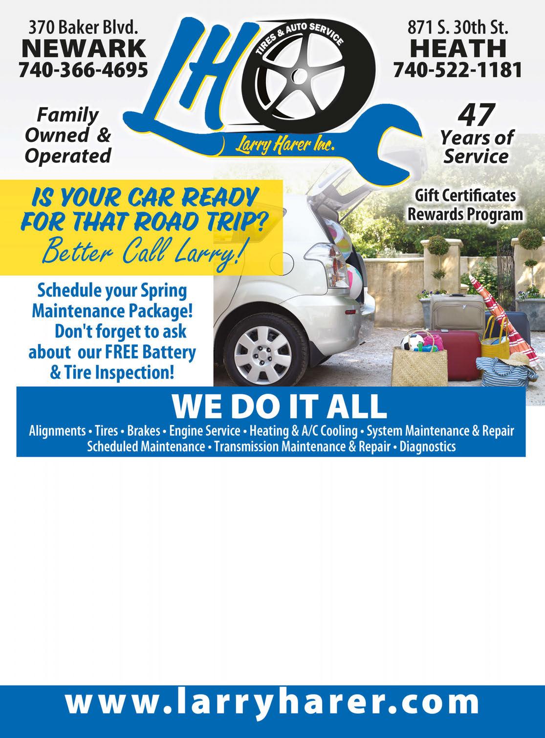 We O er Complete Mechanical Repairs For Your Car, Truck or SUV! 165 West Main St • Newark (at the corner of 6th St. & West Main St.) 740-345-3870 Discount Prices & Lifetime Guarantees on... • Heaters • Water Pumps • Radiators • New Gas Tanks • Installation of Parts • Center Intake & Head Gasket Repairs Water Pump or Heater Repair Valid only with coupon. Not valid with any other discount. One coupon per service. Offer expires 5/31/24. $10 OFF Head Gasket or Center Intake Replacement Valid only with coupon. Not valid with any other discount. One coupon per service. Offer expires 5/31/24. $50 OFF Brake Service Any Brake Repair Service Valid only with coupon. Not valid with any other discount. One coupon per service. Offer expires 5/31/24. $25 OFF A/C Recharge Does Not Include Freon or parts. Valid only with coupon. Not valid with any other discount. One coupon per service. Offer expires 5/31/24. $29.95 Cooling System Power Flush Does Not Include Antifreeze or parts. Valid only with coupon. Not valid with any other discount. One coupon per service. Offer expires 5/31/24. $59.95 Any Engine or Transmission Replacement Valid only with coupon. Not valid with any other discount. One coupon per service. Offer expires 5/31/24. $100 OFF Cars • Trucks • SUV’s ATV • Motorcycles Race Vehicles Farm Vehicles