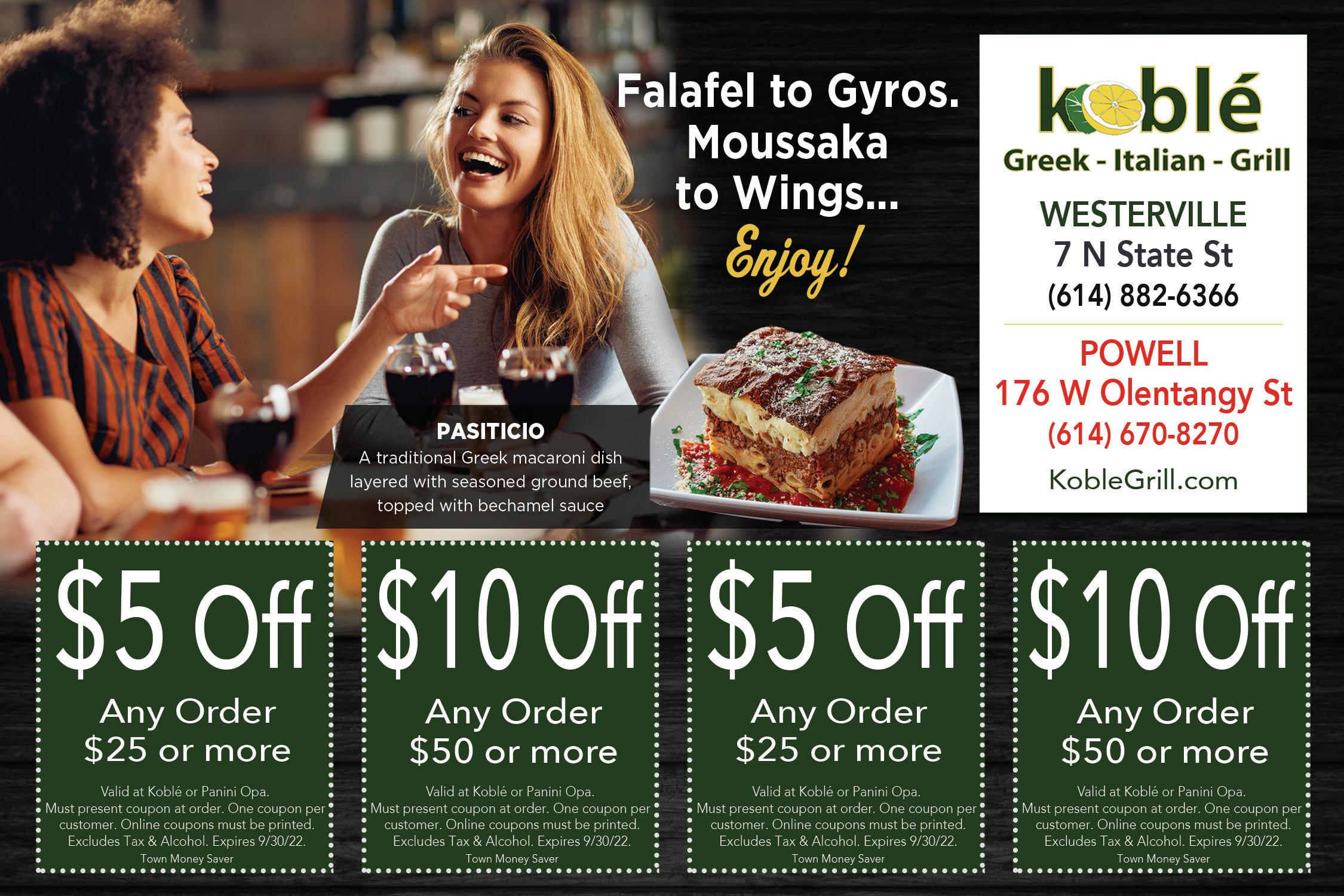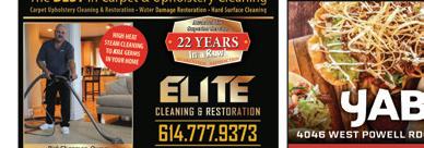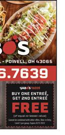 POWELL September 2022 Support LOCAL businesses! Shop local. Drive less. Save more. Brett Hatley (614) 981-6225 HatleyTeam.com Buying Selling Relocating? Call The Team You Can TRUST! Karla Hatley (614) 271-6801 . . Committed. Trustworthy. Responsible. THE FRESHEST AND BEST MEDITERRANEAN FOOD IN COLUMBUS! HOURS Mon-Sat 10:30 am – 9:30 pm Sunday 11 am – 9 pm A HEALTHIER ALTERNATIVE TO FAST FOOD! 20% OFF orders over $20. 4091 Powell Rd. • Powell 614-791-9100 greekexpressfamily.com Only one coupon per customer. Expires 9/30/22 Our proprietary L.E.A.P.® (Learning Experience Academic Program) curriculum encourages children to learn in their favorite way: by exploring and doing. We offer six stages of early childhood development from 6 weeks to 5 years old. (614) 389–1576 Enroll before month end & receive 50% OFF ONE-TIME ENROLLMENT! Expires 9/30/2022 501 Liberty Rd. N. • Powell, OH 43065 We make early education & daycare engaging and fun! Visit our website! DINE-IN • PICKUP • DELIVERY & CATERING 4046 WEST POWELL RD. • POWELL, OH 43065 614.336.7639 KITCHEN HOURS: MONDAY: CLOSED TUES–THURS: 11AM-9PM FRI & SAT: 11AM–10PM SUNDAY: 11AM–8PM BUY ONE ENTREÉ, GET 2ND ENTREÉ FREE (of equal or lesser value) Cannot be combined with other offers. Dine-in Only, Limit 1 per group. Expires 9/30/2022