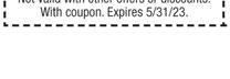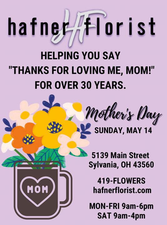 CREQUE’S GREENHOUSE Not good on mulch. Limit one per person per visit. $5 OFF Any Plant Purchase Minimum $30.00 purchase. Shrubs • 10-16” Beautiful Baskets Sun & Shade Aisle • Perennials Gift Barn Has Garden Accents Tropicals Plants (biggest selection in NW Ohio) Premium Bagged Potting Soil & Bulk Mulch Hours: Mon-Fri 9am-7pm •Sat-Sun 9am-5pm 9700 Sylvania Ave. 1 1/2 miles W. of Centennial 419-829-2941 www.crequesgreenhouse.com • Locally grown here in Sylvania Twp. • 7 Minutes from Downtown Sylvania • Great prices help keep more “green” $ for you • Huge vegetable selection - we can help • We’re packed with blooming color See why our customers keep coming back! FlowerFREE for Mom on May 13 & 14 Gift Certificates Available El Nuevo Vallarta Witn TMS coupon. Cannot be combined with any other coupon or offers. Expires 4/30/23 419-517-8024 erinanns.com Sun 10-6 Mon-Thurs 8-8 Fri & Sat 8-9 Homemade Ice Cream * Cold Press Juice Smoothies * Smoothie Bowls & more! Organic, Local, Gluten & Dairy Free DOWNTOWN SYLVANIA • 5661 MAIN STREET Reinventing the way you treat yourself! 1/2 OFF Ice Cream buygone et one (inc. Small, Med & Large)