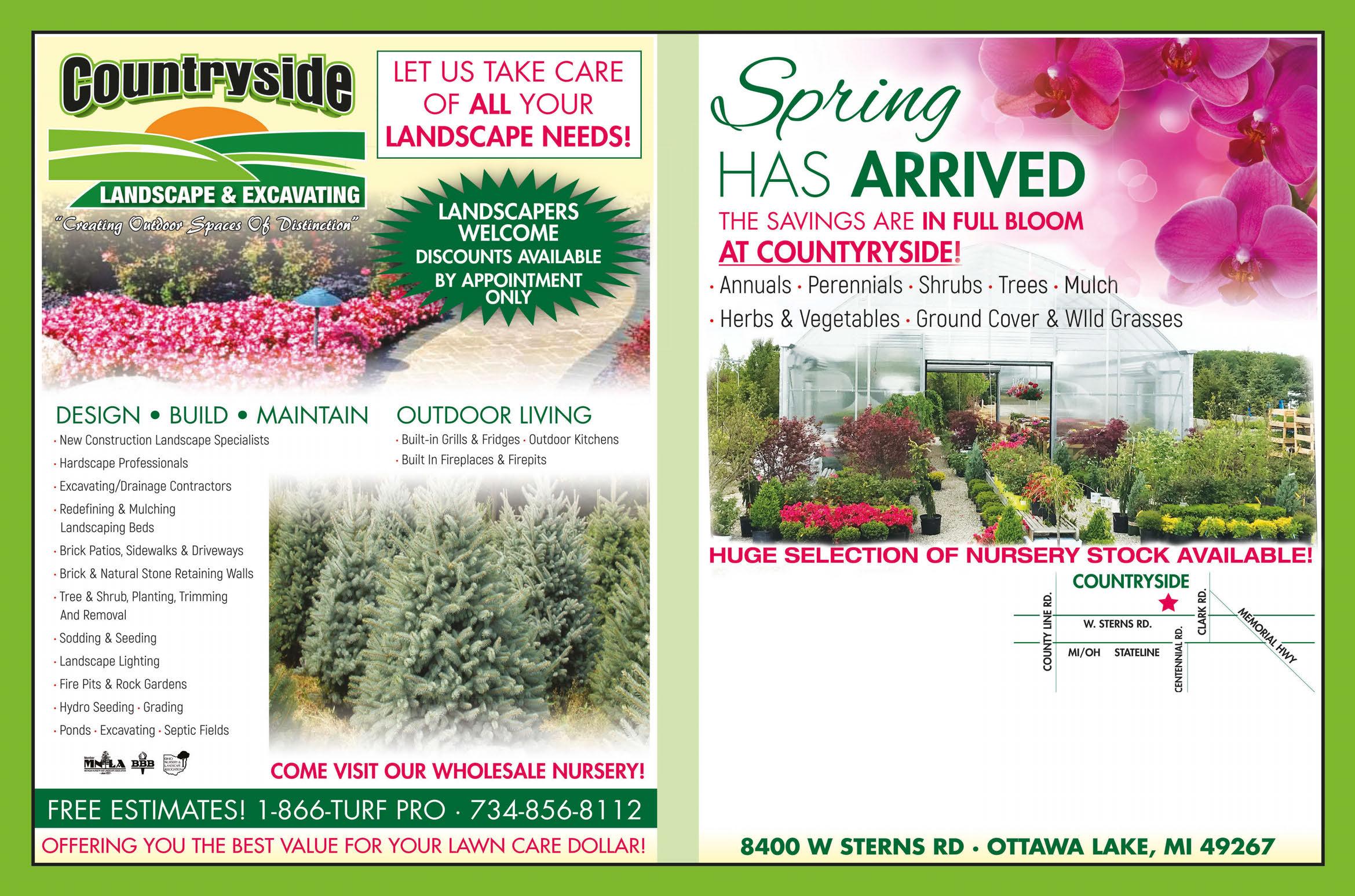 HARDWOOD MULCH INSTALLATION AVAILABLE TRIPLE PROCESSED PREMIUM $40 PER YARD BLACK GOLD MULCH $45 PER YARD PREMIUM TOP SOIL $60 PER YARD MON: Closed TUES-FRI:- 9am-6pm SAT: 9am-3pm SUN: 10am-3pm with $150 Mother'spurchase Day & MemorialWeekendDay FREE Hanging Basket *While Supplies Last FREE DELIVERY HARDWOOD MULCH PREMIUM TOPSOIL COUNTRYSIDE • 734-856-8112 With TMS coupon. Not valid with any other offers. Expires 5/31/23 WITH PURCHASE OF 5 OR MORE YARDS OF MULCH OR 5 TONS OR MORE OF TOPSOIL $20 OFF COUNTRYSIDE • 734-856-8112 With TMS coupon. Not valid with any other offers. Expires 5/31/23 COUNTRYSIDE • 734-856-8112 With TMS coupon. Not valid with any other offers. Expires 5/31/23 $200 TREE PURCHASE $195 7’ Emerald Green ARBORVITAES each