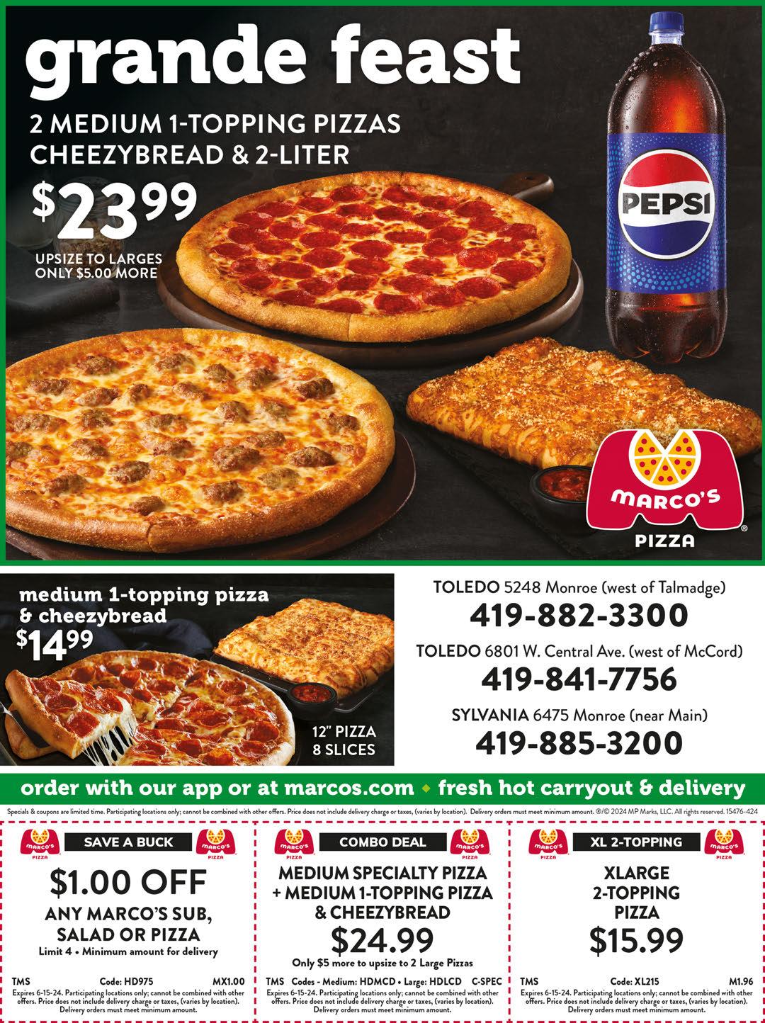 Lebanese & American Food OPEN DAILY 6:30am-4pm Dine-In or Carryout 5623 W. Alexis SYLVANIA 419-885-7520 www.sylvaniadiner.com 20% OFF YOUR BILL Min. purchase $5 or more With TMS coupon. Dine-In Only. Not valid with other offers or specials. Expires 5/31/24 Valid Mon- Fri only. Breakfast Special Eggs, Potatoes, Meat & Toast MON-FRI 6:30-11AM $699 5942 SECOR Next to REGGIE’S BIKE SHOP Just north of Alexis 419-241-3669 www.gratefulpetgrooming.net Full Groom NEW CUSTOMERS REGULAR CUSTOMERS $5OFF $3OFF OR FREE Scarfs & Bows With TMS coupon. Not valid with any other offer. Exp. 5/31/24 ARE YOU FEELIN’ IT ? HEATING & COOLING 1 YEAR MONEY BACK GUARANTEE Inquire for details 24 MONTHS Interest Free 419-969-3553 734-587-3184 Act Now! SPRING SPECIAL FREE 10 YR. LABOR & 10 YR. PARTS WARRANTY on Furnace or AC Purchase $79 MONTHLY for a Complete Furnace & AC System (Restrictions Apply, With Approved Credit) Coupon must be presented at time of purchase. With TMS coupon. Not valid with other offers. Expires 5/31/24 $79 Air Conditioner Inspection and Tune-Up Coupon must be presented at time of purchase. With TMS coupon. Not valid with other offers. Expires 5/31/24 Good things to eat since 1927! www.sauttersmarkets.com Bakery • Deli • Meat • Wine Fresh Produce Homemade Soups & Specialty Foods Order your Party Trays, Birthday & Graduation Cakes! We have a Wide Variety of WINES & MICROBREWS $5 OFF $50 Purchase Limit one coupon per family. Cannot be combined with any other offers. 9533 Waterville Swanton Rd WATERVILLE, OH 419.878.7691 5519 S. Main St. Sylvania, OH Corner of Monroe & S. Main 419.885.3505 Coupon must be presented at time of purchase only. Excludes alcoholic beverages, gift cards, postage stamps and prior purchases. No cash value/refund. Expires 5/31/24. STMS