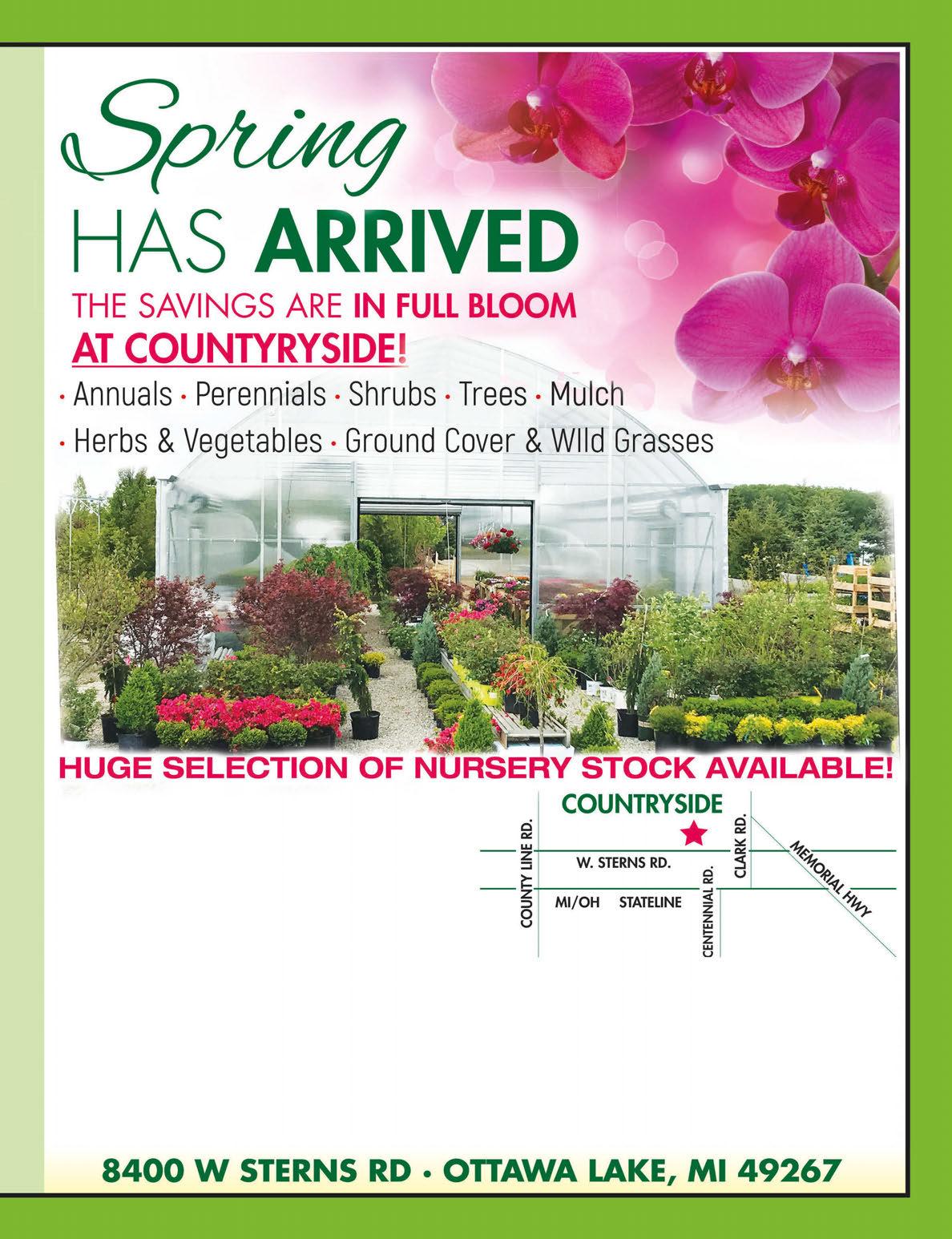 HARDWOOD MULCH INSTALLATION AVAILABLE TRIPLE PROCESSED PREMIUM $40 PER YARD BLACK GOLD MULCH $45 PER YARD PREMIUM TOP SOIL $60 PER YARD HOURS Monday - Friday 9am - 6pm Sat & Sun 9am - 3pm with $150 Mother'spurchase Day & MemorialWeekendDay FREE Hanging Basket *While Supplies Last FREE DELIVERY HARDWOOD MULCH PREMIUM TOPSOIL COUNTRYSIDE • 734-856-8112 With TMS coupon. Not valid with any other offers. Expires 5/31/24 WITH PURCHASE OF 5 OR MORE YARDS OF MULCH OR 5 TONS OR MORE OF TOPSOIL $20 OFF COUNTRYSIDE • 734-856-8112 With TMS coupon. Not valid with any other offers. Expires 5/31/24 COUNTRYSIDE • 734-856-8112 With TMS coupon. Not valid with any other offers. Expires 5/31/24 $200 TREE PURCHASE $195 7’ Emerald Green ARBORVITAES each