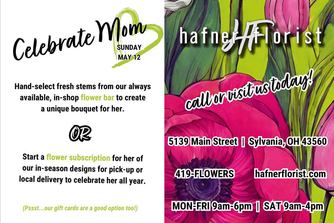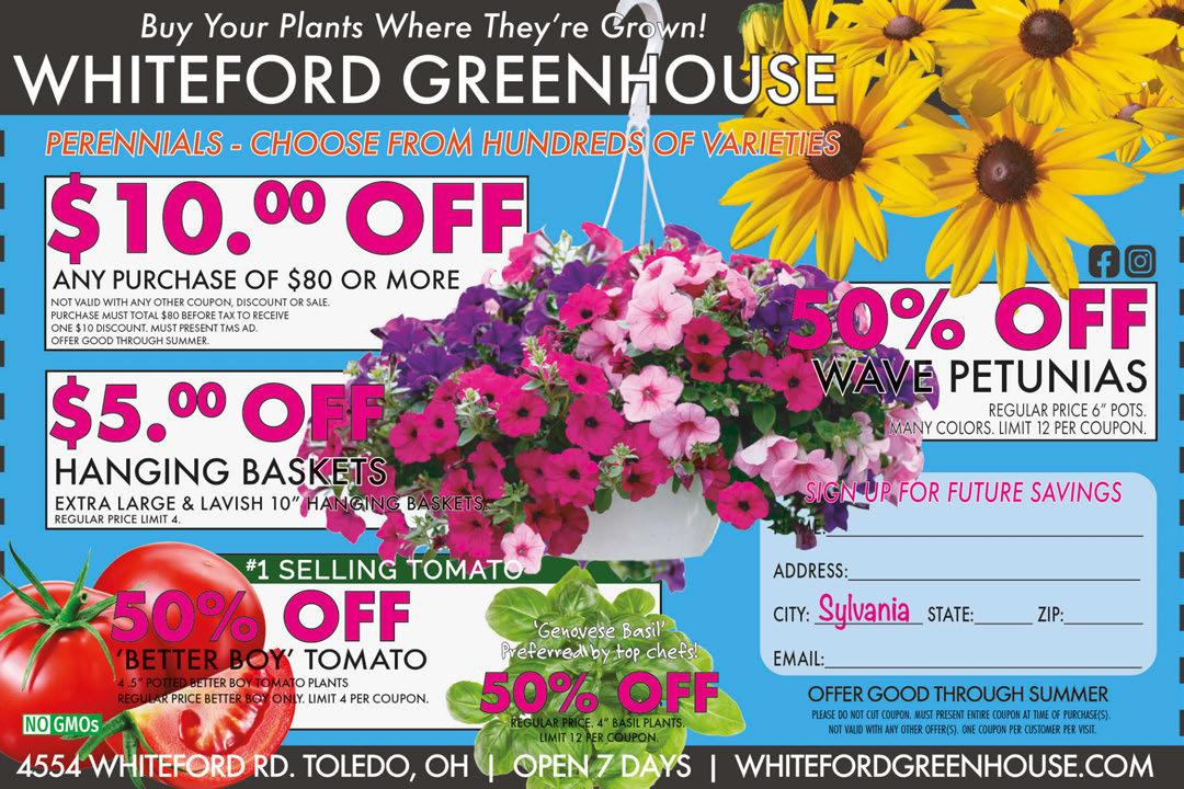 Order online: www.VaqueroRestaurant.com 3302 Secor Toledo 419-536-0471 Scan to order online: Now offering delivery! Visit our website for details! Download our Mobile App for specials! We accept competitors coupons from Authentic Mexican Food (up to $6.00) happy hour daily 4-8Margarita & SpecialsBeer kids eat free on Tuesdays One Free Kid’s Meal Per Adult Entree our patio is open!now Sun May 5 With Food & Drink Specials We prepare our food Fresh Daily with the highest quality ingredients! CREQUE’S GREENHOUSE Not good on mulch. Limit one per person per visit. Expires 6/14/24 $5 OFF Any Plant Purchase Minimum $30.00 purchase. Shrubs • 10-16” Beautiful Baskets Sun & Shade Aisles • Perennials Gift Barn Has Garden Accents Tropicals Plants (biggest selection in NW Ohio) Premium Bagged Potting Soil & Bulk Mulch Hours: Mon-Fri 9am-7pm •Sat-Sun 9am-5pm 9700 Sylvania Ave. 1 1/2 miles W. of Centennial 419-829-2941 www.crequesgreenhouse.com • Locally grown here in Sylvania Twp. • 7 Minutes from Downtown Sylvania • Great prices help keep more “green” $ for you • Huge vegetable selection - we can help • We’re packed with blooming color See why our customers keep coming back! FlowerFREE for Mom on May 11 & 12 Gift Certificates Available