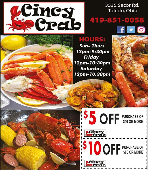 2516 W. Sylvania Ave. Located at the corner of Douglas 419.472.EGGS Mon-Fri 7am-2pm Sat & Sun 7am-3pm Alcohol served after 11am Sunday 2 Eggs, Home Fries, Meat & Toast $599 With purchase of any beverage - Mon-Fri 7am-11am PATIO Now Open! 20% OFF Minimum Purchase $5 Dine-In Only Excludes Alcohol Mon-Fri only. Max. discount $10 EXECUTIVE DINER Not valid on holidays. Not valid with any other offer. One per table. Exp. 5/31/24 5226 Monroe St • 419-843-4472 ROHR Fish Inc. COMPLETE LINE OF Fresh & Saltwater Fish, Seafood & Fresh Prepared Specialities! SEAFOOD SENSATIONS Salmon Cakes • Crab Cakes Lobster Dip • Shrimp Dip SOUPS Clam Chowder • Seafood Chowder ROHR FISH INC. ROHR FISH INC. $2 OFF Any purchase of $20 or more HOURS: Mon-Fri 9:30-5 Sat 9:30-4 Closed Sun Not valid with other offers. Expires 5/31/24 Shrimp Lovers Paradise! $1 OFF every pound of shrimp Not valid with other offers. Expires 5/31/24 Large Variety • No Limit Toledo’s #1 Gourmet Seafood Company Try Rohr’s Homemade “Heat & Serve”