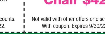 $5 OFF $30 FOOD PURCHASE EXCLUDES ALCOHOL El Salto 419-824-0049 With TMS coupon. Dine-in only. Not valid other offers. Expires 9/30/22 $4 OFF TWO LUNCHEON SPECIALS EXCLUDES ALCOHOL El Salto 419-824-0049 With TMS coupon. Dine-in only. Not valid other offers. Expires 9/30/22 AUTHENTIC MEXICAN RESTAURANT MONDAY $1 Hard Shell Taco • TUESDAY Street Tacos (3) $7.99 WEDNESDAY 15% Off Seniors & Military • THURSDAY $3 OFF Fajitas FRIDAY/SATURDAY Margarita Specials • SUNDAY Kids Eat Free (1 with each adult meal) FULL BAR! TMSS SUN 11:30AM-9PM • MON-THURS 11AM-10PM • FRI-SAT 11AM-10:30PM TMSS 15% OFF ANY FOOD PURCHASE EXCLUDES ALCOHOL • Not valid Fri & Sat El Salto 419-824-0049 With TMS coupon. Dine-in only. Not valid other offers. Expires 9/30/22 TMSS Just west of Corey Rd • ElSaltoOhio.com 5817 MONROE ST SYLVANIA • 419-824-0049 Carry-Out MARGARITAS still available with purchase of a meal HAPPY M-FHOUR 2-5pm 6925 W. CENTRAL Just West of McCord 419-841-HOME • 419-841-4663 Call to Find Out More or email: consignithome@gmail.com Upscale Resale and Brand New Home Concepts Mall (booth space available) consignittoledo.com We CONSIGN, BUY & SELL Pickup & Delivery Available NewStockDaily! Decorate for less! HOME INTERIORS 1815 SYLVANIA AVE. • TOLEDO • 419-472-2040 AIR CONDITIONING • Central Air Conditioning • Mini-Split Air Conditioning RETAIL PARTS CENTER Appliance Parts • Air Conditioners • Boilers & Furnaces • Water Heaters FILTERS & HUMIDIFIERS • WATER HEATERS We Service All Brands Of Air Conditioners, Furnaces & Boilers Are you tired of that old furnace breaking down? A new high efficient gas furnace can save up to 40% on your gas bill. Call us today for your FREE ESTIMATE! HEATING • Gas Boilers • Gas & Electric Furnaces up to $30000 UTILITY REBATE Complete Cleaning & Safety Inspection $119 Furnace or A/C One coupon per qualified purchase. Must present coupon at time of estimate. Not valid with any other offer.Exp. 9/30/22 SAVE $100 On a New Furnace or A/C One coupon per qualified purchase. Must present coupon at time of estimate. Not valid with any other offer.Exp. 9/30/22 SAVE $200 On a Furnace AND A/C One coupon per qualified purchase. Must present coupon at time of estimate. Not valid with any other offer.Exp. 9/30/22