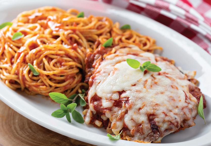 Veal Parmigiana Tender veal handbreaded and fried then topped with housemade tomato sauce and mozzarella. Served with spaghetti with tomato