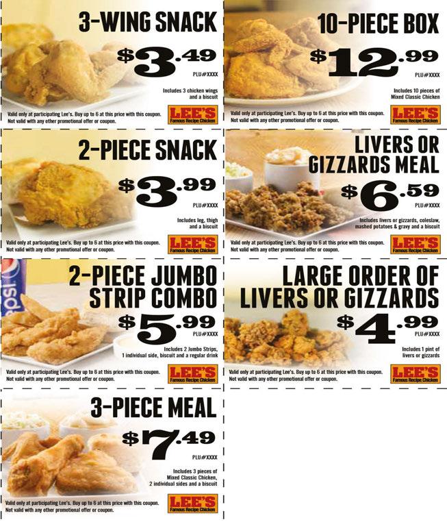 571 E. Center St., Marion, OH 740-387-3277 Expires 8/15/23. Expires 8/15/23 Expires 8/15/23. Expires 8/15/23. Expires 8/15/23. Expires 8/15/23. Valid only at participating Lee’s. Buy up to 4 at this price with this coupon. Not valid with any other promotional offer of coupon. Expires 8/15/23. Expires 8/15/23. 4-PIECE MIXED Includes a biscuit, mashed potatoes & gravy and coleslaw $9.99 Valid only at Marion location. Not valid with any other promotional offer or coupon. Expires 8/15/23. 10%OFF CATERING
