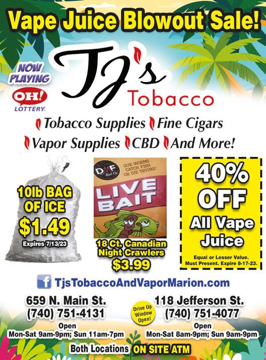 MARION Shop locally. Save locally. July 2023 *Any applicable parts or freon not included. • TOBACCO • VAPE • CBD & KRATOM • SNACKS • AND MORE! SOLD HERE ICE COLD BEER, WINE & BAR SERVICE AVAILABLE! FREE Lighter with any 3pk cigarette purchase 5AM TO 3AM EVERYDAY BEER SALES & BAR SERVICE UNTIL 2:30AM NOW For details call: 740-389-4682 It’s Time to Plan For Your Future! We are accepting applications. Welding • Industrial Maintenance Public Safety Services • Robotics Tri-Rivers Adult Workforce Education Marion, OH 43302 ramtecohio.com tririvers.com