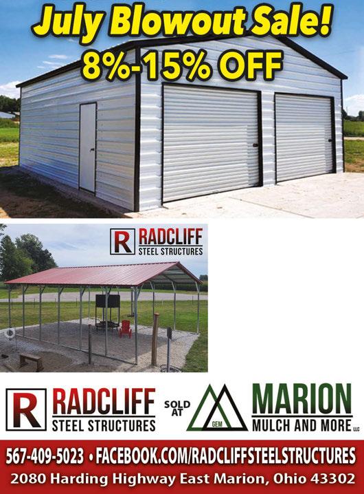 740.361.1495 phil@bruggerqualityconstruction.com “Quality Matters” Phil Brugger, Owner 2035 Agosta-Meeker Rd New Bloomington, Ohio 43341 NEW SHOWROOM! 740-751-3311 CALL OR TEXT 131 W.Center St. Order Today $25 OFF ANY BANNER ORDER HUGE BANNER SALE! OUR PRODUCTS: • Barns & Agricultural • Custom Buildings • RV Carports • Work Shop • Clear Span • Carports • Garages Visit Us Online Facebook.com/Radcliffsteelstructures