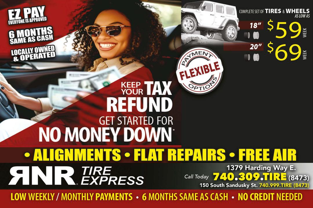 FREE ALIGNMENT CHECK Get a free alignment check when you schedule your service with us. Some restrictions may apply. Offer subject to chanage without notice. Additional services may be needed at an additional cost. Expires 4/15/24 RNR Tire Express ©2024 FREE FLAT TIRE REPAIR Get a free flat tire repair when you schedule your service with us. Some restrictions may apply. Offer subject to chanage without notice. Additional services may be needed at an additional cost. Expires 4/15/24 RNR Tire Express ©2024 RNR Flexible Payment Options allow you to get the product you need today and pay for it with easy weekly, bi-weekly or monthly payments. Everyone’s Approved! Example: set (4) 18” tires and wheels - $49 x 78 weeks - $3822 plus tax and any additional parts or service. See team member for complete details. MARION PHONE: 740-375-4300 • 740-375-4301 1322 Mt. Vernon Ave. • Marion, OH 43302 Sunday-Thursday 11am-10pm Friday-Saturday 11am-11pm WE DELIVER! NO CONTACT DELIVERY AVAILABLE UPON REQUEST DRIVERS! NOW AVAILABLE ON PAY IN CASH & GET 10% OFF