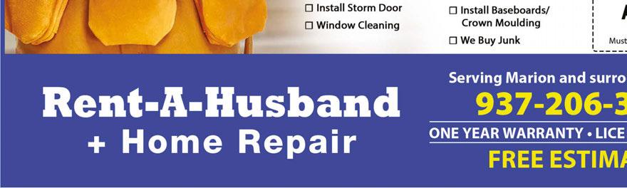 MARION Published By Town Money Saver, Inc. Corporate Office • PO Box 356 • Lucas, OH 44843 © 2024 TMS Franchising, Inc. All rights reserved. For advertising information, call 740-751-3311 NEXT ISSUE IN HOMES: April11, 2024 ADVERTISING DEADLINE: March 27, 2024 PRSRT STD ECRWSS U.S. POSTAGE PAID Town Money Saver, Inc. townmoneysaver.com $500 OFF STANDARD METAL ROOF Amish Metal Roofing