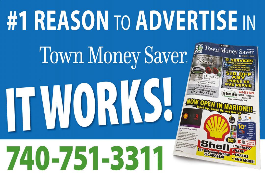 MARION Published By Town Money Saver, Inc. Corporate Office • PO Box 356 • Lucas, OH 44843 © 2022 TMS Franchising, Inc. All rights reserved. For advertising information, call 740-751-3311 NEXT ISSUE IN HOMES: June 15, 2023 ADVERTISING DEADLINE: May 31, 2023 PRSRT STD ECRWSS U.S. POSTAGE PAID Town Money Saver, Inc. townmoneysaver.com 127 S. Main St. Buy One, Get One 1/2 OFF Any Milkshake or Namesake Valid with coupon. Expires 6/15/23 FREE INSPECTION & ESTIMATE! 200 Ft. East of Del Taco Expires 6/15/23