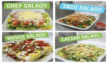 Taco Salad Lettuce, onions, nacho chips, tomatoes, taco beef, black olives, and cheddar cheese & mozzarella with taco sauce on the side.