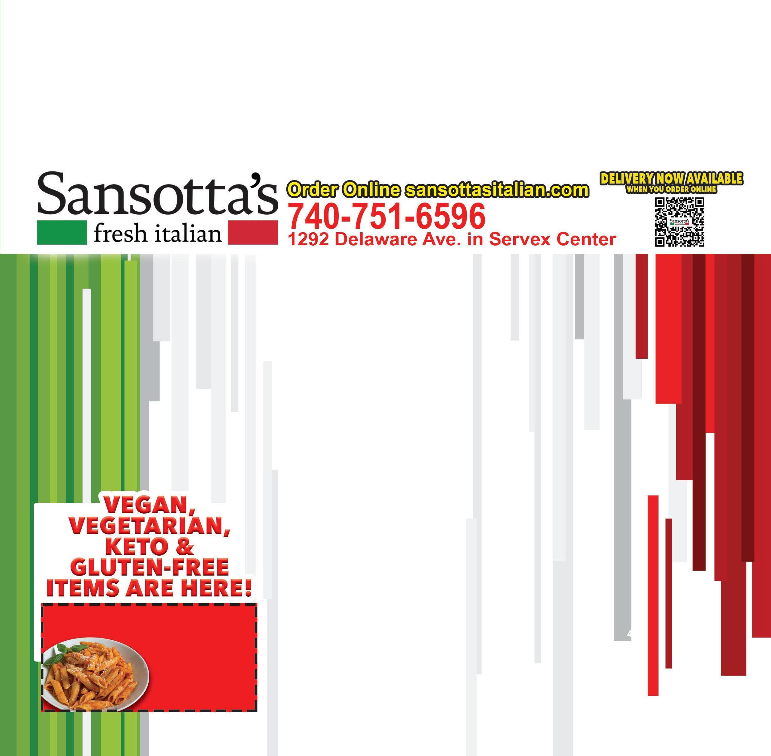 facebook.com/SansottasItalian Sansottasfreshitalian@yahoo.com Catering Always Available NOW AVAILABLE 48oz Cartons of Homemade Ice Cream • Pints of Gelato Ice Cream Sandwiches & Fudge Any Pasta Bowl or Salad Must present coupon. Not valid with other offers. Expires 11/10/22. $1.00 OFF Prices are subject to change at any time PIZZA FOR YOUR GAMEDAY! CALAMARI & SHRIMP SCAMPI NOW AVAILABLE BUSY WEEK? TRY OUR GRAB N GO FREEZABLE MEALS Available in Lasagna, Baked Manicotti or Beef & Noodles Catering for Your Office Luncheon, Party or Big Game! PICKUP & DELIVERY AVAILABLE ON TOAST. DOWNLOAD THE APP! DAILY SPECIALS LISTED ON FACEBOOK
