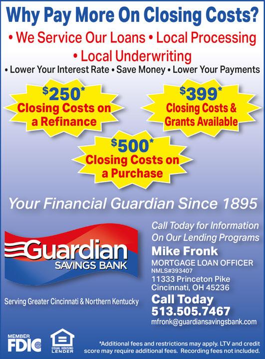 Ross Gibson, DDS 17 N. Mechanic Street • Lebanon, OH 45036 513-932-2851 | lcdentistry17@gmail.com Here’s her reas to smile this Spring! $1000 Off Our Comprehensive Case and $500 Off Our Limited Case Call today to find out if you qualify! Looking to stay cool this summer? Don’t forget about a Spring Clean and Check Climate Control Specialist, LLC 513-282-6300 www.ccsheatingcooling.com Call Tim today... He is your guy! tim.jennings@sbcglobal.net or 513-282-6300 STAY COOL THIS SUMMER & SAVE BIG! SAVE UP TO $1,650 On A Qualifying Carrier® System* *Limited time offer. Based on qualifying equipment and an ECM motor. WITH FACTORY AND UTILITY REBATES CALL FOR DETAILS! SPRING A/C TUNE-UP NOW ONLY Cannot be combined with any other coupons or specials. Call To Schedule Your Appointment Today! Cannot be combined with any other coupons or specials. Expires 5/31/2023. $7900 per unit Make a Don’t just Advertise... with a great offer in Town Money Saver! SCHEDULE ISSUE DEADLINE IN HOME June May 17 June 1 July June 14 June 29 August July 19 Aug 3 THIS COULD BE YOUR OFFER Distributed locally to attract the repeat customers that you really want! CALL TODAY FOR MORE INFORMATION 937-901-5393 jonbucher@townmoneysaver.com