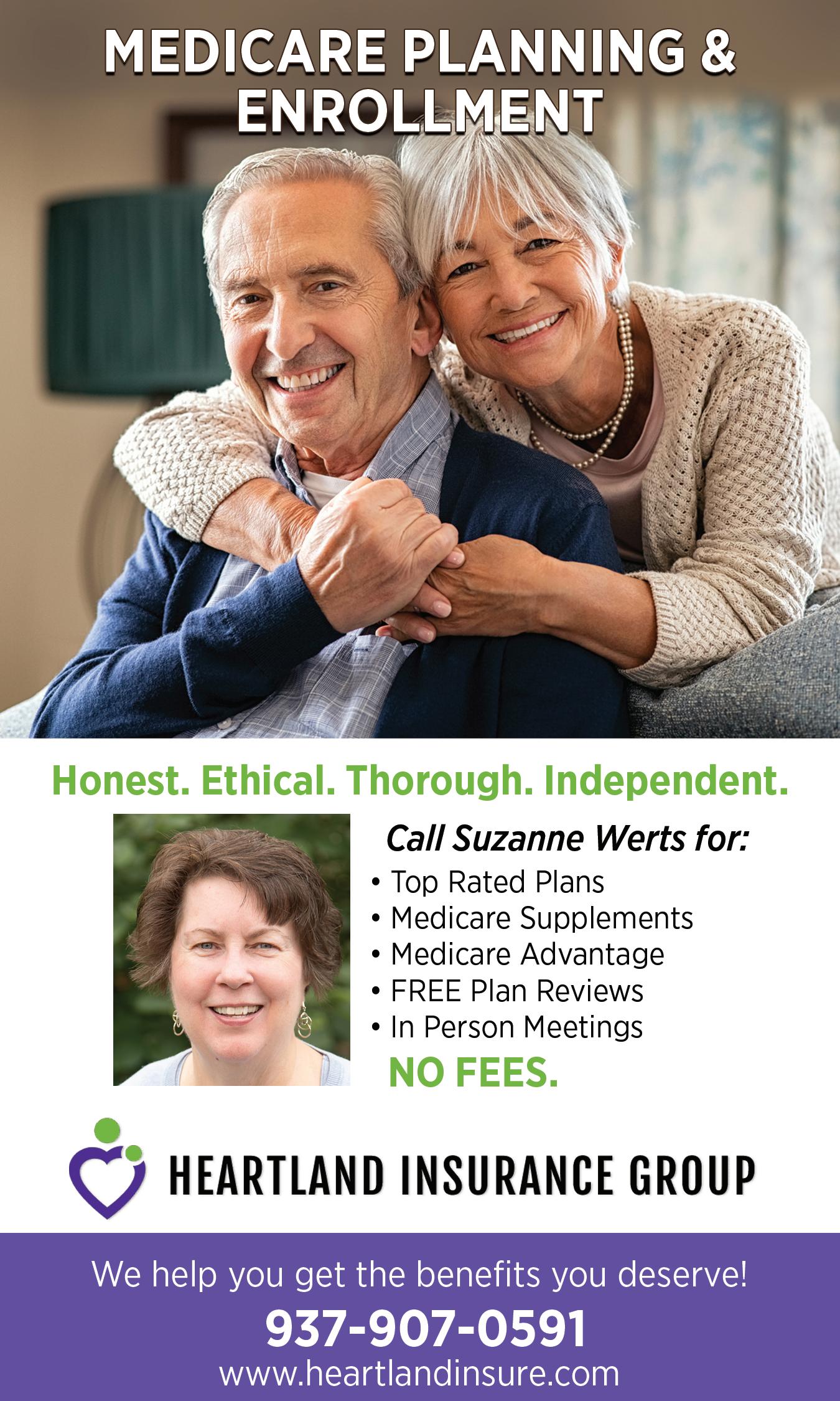 Local. Trusted. Independent. Call Suzanne Werts for: • Top Rated Plans • FREE Plan Reviews • Medicare Supplements • Medicare Advantage NO FEES We help you get the benefits you deserve! 937-886-8560 | heartlandinsure.com Heartland Insurance Group is not connected with or endorsed by the United States government or the federal Medicare program. We do not offer every plan available in your area. Any information we provide is limited to those plans we do offer in your area. Please contact Medicare.gov or 1-800-MEDICARE to get information on all of your options.