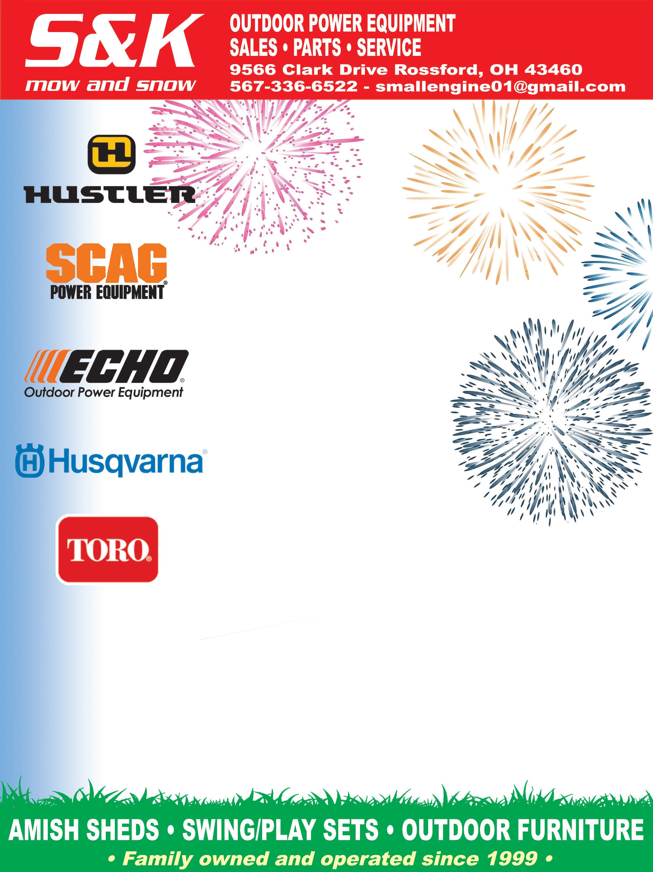 Your small engine care and repair center • Riding & Push Mower repairs • Chain Saw and Rototiller repairs • Edge trimmer and Leaf Blower repairs • Snow Blower repair • Pressure washing • Carburetor rebuilds • Engine Diagnosis • Fix & Repair Tires • Sharpen/Replace Cutting Blades • New Battery Installations • Pick-Up and Delivery available MOWING SEASON is here! Lawn mower or equipment need service or repair? Call S&K! 567-336-6522 www.skmowercenter.com S&K mow and snow FREE GIFT For First Time CUSTOMERS
