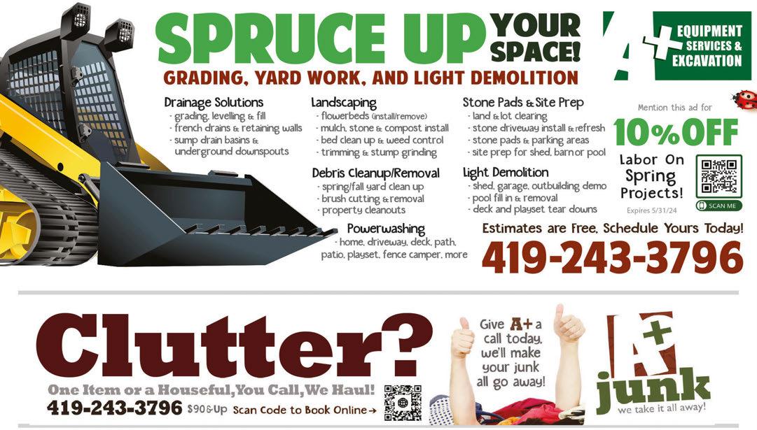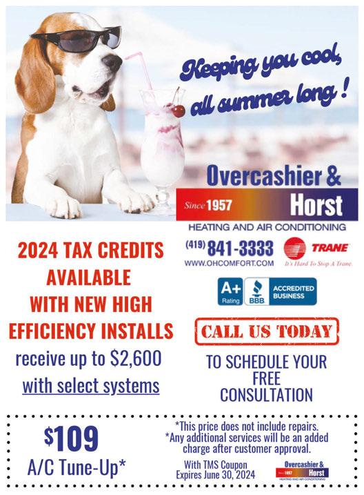 AFTER BEFORE With TMS Coupon. Not valid with any other offer. Expires 6/30/24 $100 OFF Any $1000 Project - OR$250 OFF Any $2000 Project A Full Service Painting Company INTERIOR & EXTERIOR PAINTING and Kitchen Cabinets! Your Painting Project Begins Here! 419-344-1811 frogtowncompanies.com We remove dangerous trip hazards & negative drainage DUE TO SUNKEN CONCRETE SURFACES on: Patios, Garage Floors, Sidewalks & Driveways CallPete! 10% OFF with this ad 419-351-4124 A+ MidwestConcreteLeveling.com Free Estimates We do Concrete POWERWASHING & SEALING! Sunken Concrete? Water Puddles Along Foundation? WE CAN HELP! Midwest Concrete Leveling & Sealing, LLC Maximum discount $200.00 Please present coupon at time of estimate. Not valid with other offers. Expires 6/30/24 ARE YOU FEELIN’ IT ? MONEY BACK GUARANTEE Inquire for details Coupon must be presented at time of purchase. Does not include 80% furnaces. With TMS coupon. Not valid with other offers. Expires 6/30/24 $1500 OFF Complete Furnace & AC System With TMS coupon. Not valid with other offers. Expires 6/30/24 $8999 Air Conditioner clean & check Summer Special! Your Comfort System Specialist! 419-969-3553 • 734-587-3184 HEATING & COOLING 24 MONTHS Interest Free EARLY SPECIAL