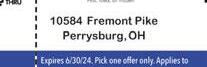 Expires 7/31/24 MEXICAN GRILL & BAR AIRPORT/WEST 7011 Airport Hwy. 41-866-8229 ROSSFORD 1213 Schreier Rd. 419-666-3288 ALEXIS/NORTH 304 E. Alexis 419-478-7530 NEW LOCATION 2825 Glendale 419-796-4718 Serving only QUALITY, FRESH ingredients at Affordable Prices! NOW 4 LOCATIONS TO SERVE YOU! HAPPY HOUR MON-SAT 3-5:30PM APPETIZERS, BEER & MARGARITAS 5demayotoledo.com Anypurchase of $40 or more ExcludesAlcohol.Withcoupon. Dineinonly.Onecoupon perperson.Notvalidwith anyotheroffers. Exp.6/30/24 ANY LUNCH Dineinonly.Withcoupon. Cannot be combined with other offers. Exp.6/30/24 LunchSpecialLunchMenuOnly. Sun June 16 Father’sDay 1/2 OFF $8off $599 Dad’s Meal WithTMScoupon.Dineinonly.Notvalidwithanyotheroffers. Validon6/16/24only. 1/2OFF Dinner Entree GLENDALELOCATIONONLY. Dineinonly.WithTMScoupon.Cannotbe combinedwithotheroffers.Exp.6/30/24 Uptotwopeople per coupon. FACEBOOKOFFER:Thiscouponis validifyoushowustheoffer onFacebook. Up to two people per coupon. PERRYSBURG Published By Town Money Saver, Inc. Corporate Office • PO Box 356 • Lucas, OH 44843 © 2016 TMS Franchising. All rights reserved. For advertising information, call Terri at 419.351.0783 NEXT ISSUE IN HOMES: June 26-28 ADVERTISING DEADLINE: June 12 PRSRT STD ECRWSS U.S. POSTAGE PAID Town Money Saver, Inc. townmoneysaver.com