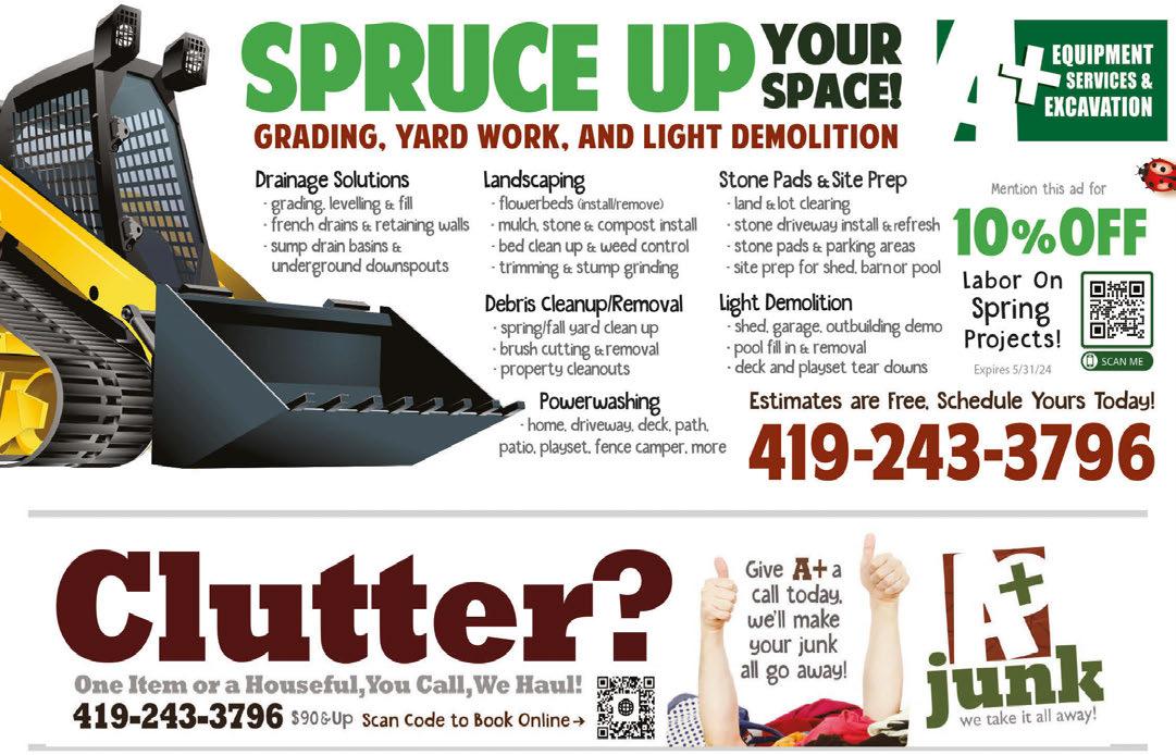 We remove dangerous trip hazards & negative drainage DUE TO SUNKEN CONCRETE SURFACES on: Patios, Garage Floors, Sidewalks & Driveways CallPete! 10% OFF with this ad 419-351-4124 A+ MidwestConcreteLeveling.com Free Estimates We do Concrete POWERWASHING & SEALING! Sunken Concrete? Water Puddles Along Foundation? WE CAN HELP! Midwest Concrete Leveling & Sealing, LLC Maximum discount $200.00 Please present coupon at time of estimate. Not valid with other offers. Expires 5/31/24 PUT YOUR AD HERE Call 419-351-0783 Town Money Saver ® LOOKING for NEW customers? This space could be YOURS! 419-350-5633 • 1475 Arrowhead Rd., Maumee 43537 Stop in or call DAN DIMARIO NEW YEAR... NEW CAR! StillGreatDeals! NEW & PREOWNED VEHICLES Thank You! To All of My Past & Present Customers ARE YOU FEELIN’ IT ? HEATING & COOLING 1 YEAR MONEY BACK GUARANTEE Inquire for details 24 MONTHS Interest Free 419-969-3553 734-587-3184 Act Now! SPRING SPECIAL FREE 10 YR. LABOR & 10 YR. PARTS WARRANTY on Furnace or AC Purchase $79 MONTHLY for a Complete Furnace & AC System (Restrictions Apply, With Approved Credit) Coupon must be presented at time of purchase. With TMS coupon. Not valid with other offers. Expires 5/31/24 $79 Air Conditioner Inspection and Tune-Up Coupon must be presented at time of purchase. With TMS coupon. Not valid with other offers. Expires 5/31/24