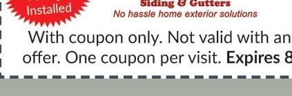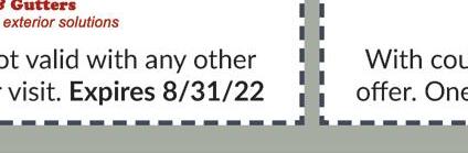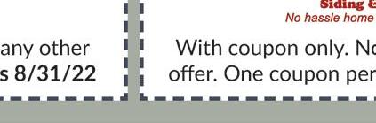 Must mention coupon when scheduling. Not valid with other o ers or discounts. Some restrictions apply. Expires 8/30/22.