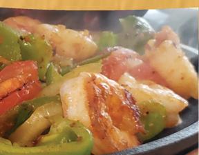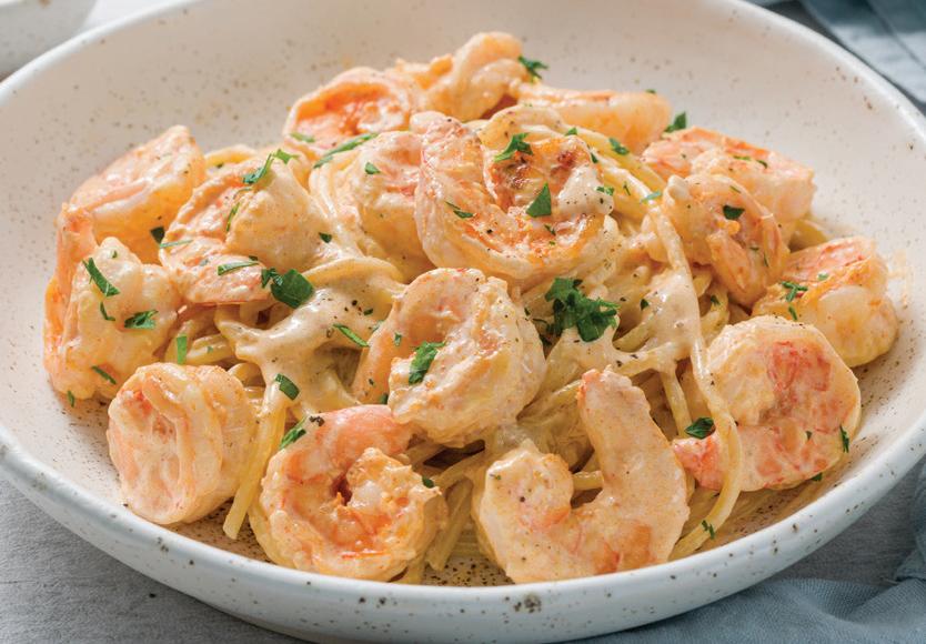 Mediterraneo Chopped clams tossed with spaghetti in a creamy, spicy seafood sauce topped with grilled shrimp.