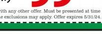 * One coupon per customer, can’t be combined with other offers, some restrictions apply, expires 05/31/24