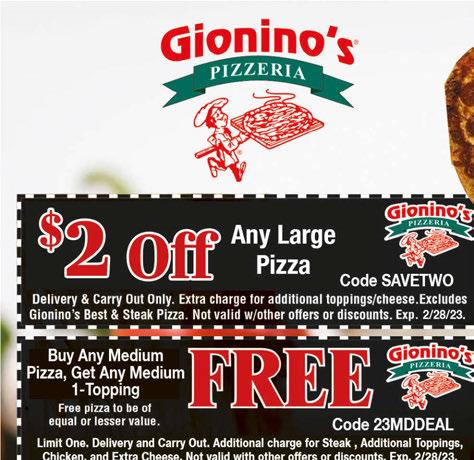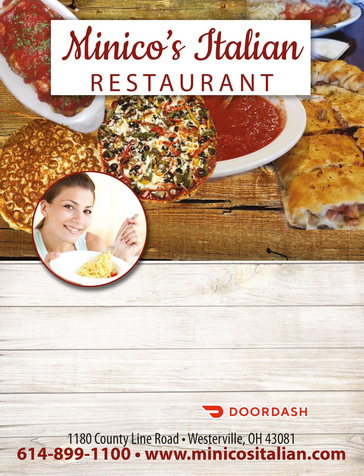 MONDAY - $7.95 Spaghetti Dinner with Meatball TUESDAY - $12.50 Large 1 Item Pizza* (Avail. for Carryout) WEDNESDAY - $11.50 Meat Lasagna Dinner THURSDAY - $12.00 Chicken or Veal Parmesan Dinner Spaghetti OR Ziti Dinner with 4 meatballs, quart of salad & dinner rolls $19.95 $3 OFF $10 OFF $5 OFF (Carry-Out Only) (Dine-In or Carry-Out) (Dine-In or Carry-Out) (Dine-In or Carry-Out) Family Pasta Dinner Minico’sMinico’s Minico’s Minico’s Any Large Pizza $50 Purchase $25 Purchase Not valid with any other offers. Expires 3/2/23.Not valid with any other offers. Expires 3/2/23. Not valid with any other offers. Expires 3/2/23. Not valid with any other offers. Expires 3/2/23. Daily Specials! DINING ROOM OPEN Wednesday ru Saturday 4pm-8pm
