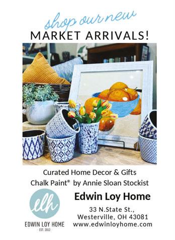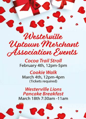 20 S. State St, Westerville, OH 43081 614-395-3931 Hours: Sun Closed, Mon 12pm-4pm Tue-Thu 12pm-8pm, Fri & Sat 12pm-9pm • Decadent Hot Chocolate • Artisan Chocolates • Cakes & Tortes • Chocolate Dipped Treats • Authentic Italian Gelato Pre-Order Your Chocolate Covered Strawberries (Open Sunday Feb 5th & 12th) 20 W. Main Street, Westerville, OH 43081 614-400-5779 www.greenhavenliving.org Hours: Tues-Fri 11am-6pm, Sat 11am-5pm Sustainable + Eco-Friendly + Zero Waste green haven living Westervi e Florist 14 South State St, Westerville, OH 43081 614-882-2000 • westervilleflorist.net Hours: Mon-Fri 11am-4pm Sat 10am-3pm, Sun Closed • Custom Floral Arrangements • Flower Subscriptions • Balloons, Buckeyes, Bears & More • Gift Certificates $10 Off Any Purchase of $50 or more Must present a coupon at time of purchase. Expires 3/2/23. Online code: WTMS23 PREORDER NOW For Valentine’s Day Delivery Deadline is 2/10/23. 44 N. State Street Westerville, OH 43081 614-823-8800 www.atwistonolives.com • Extra Virgin Olive Oil • Balsamic Vinegars • Specialty Vinegars • Gift Baskets A TWIST ON OLIVES FREE Bottle of Oil or Vinegar (60ml) With any purchase of $25 or more. (Excludes Specialty Oils) Must present coupon at time of purchase. 1 coupon per customer. ot valid with any other offer or discount. Expires 3/2/23. Hours: Tues-Sat 11a-5p Ohio Art Market Presenting Ohio Handmade 18 N. State Street Westerville, Ohio 43081 614.259.3515 www.purerootsboutique.com PURE ROOTS Boutique & Gallery Handmade • Locally Grown 16 E. College Ave Westerville, OH 43081 614-899-6110 www.mycousinscottage.com • Home Decor • Furniture • Kitchen Goods Hours: Mon-Sat 11am-6pm; Sun Closed My Cousin’s Cottage $5.00 OFF ANY PURCHASE OF $25 OR MORE Must present coupon. Cannot be combined with any other offer or discount. Expires 3/2/23.