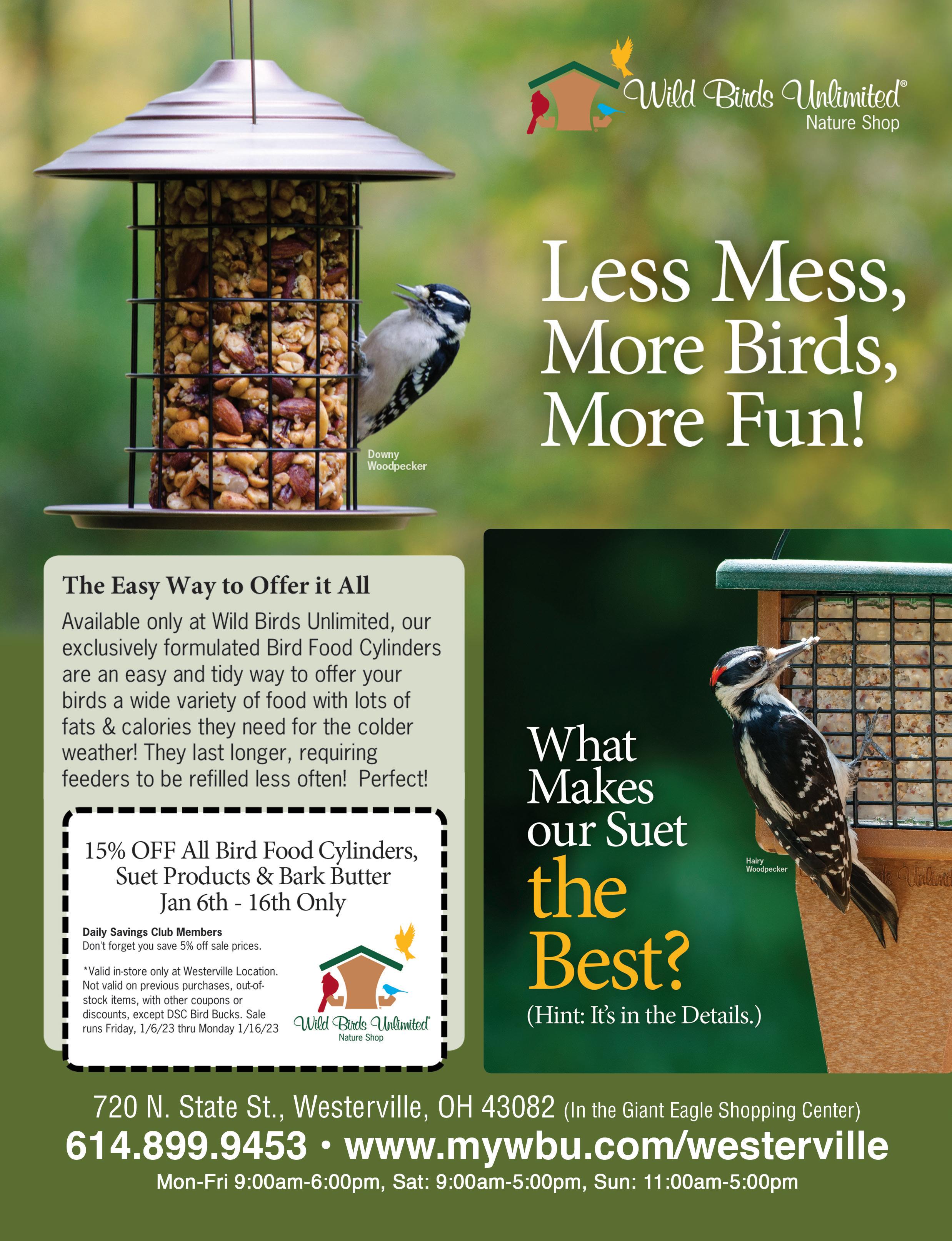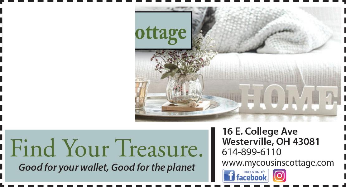To advertise call: 614.679.8160 Town Money Saver Coupon savings from your favorite neighborhood businesses Save Locally 12 East Main Street Westerville, OH 43081 614-882-8863 www.captivating-canines.com Captivating Canines $5.00 OFF ANY PURCHASE OF$25 OR MORE Excludes pet food. With coupon. Expires 2/2/23. Distinctive Gifts for Dog & Cat Lovers! Treats, Toys, Pet Memorial Memorabilia, Dog & Cat Food, & Much More! 8 E. Main Street Westerville, OH 43081 614-895-7420 www.uptownwesterville.us/ grandfatherclockcompany/ • Antiques • Collectibles • Vintage, Antique & New Clocks Grandfather Clock Company We are central Ohio’s only clock shop to have sales and repair under one roof! Hours: Mon-Fri 10am-5pm Sat 10am-3pm; Closed Sun 20 N. State Street Westerville, OH 43081 614-423-8091 www.CindaLouShop.com Gift Items • Cards • T-Shirts Jewelry • Records • Framed Art ~ plus ~ Fun & Funky 60’s & 70’s Vintage
