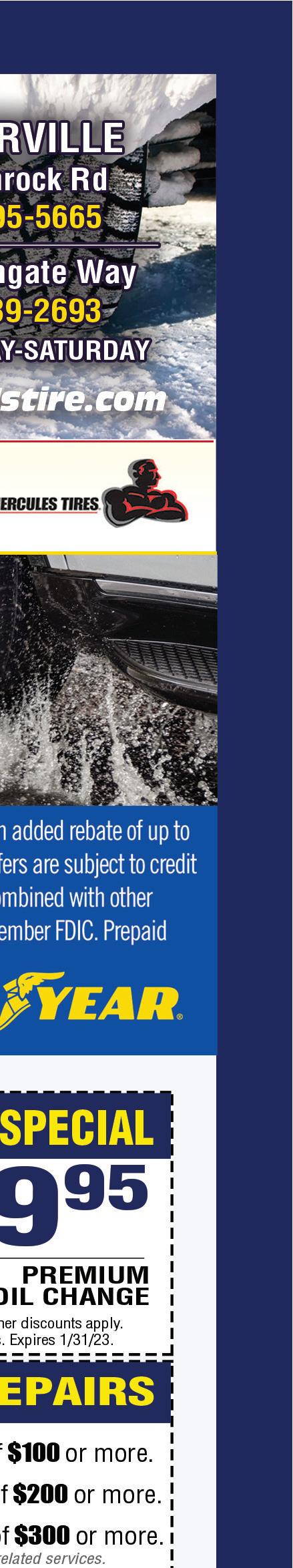 National Best Price! $49999 SC6100 • Dual motor system for edge-to-edge suction to extract deep stains • Large 10.5” rotating brush for forward & backward movement • Removable 1.75 gal solution tank and 2 gal recovery tank. Save $150 9501AM • Automatic X4 Pet Upright Vacuum • 40-foot electric cord • Electronic Height Adjustment keeps you Cleaning Correctly on all floor surfaces • Belts Guaranteed for the Life of the Machine • Hospital-grade S-class filtration - 99.9% effective to 0.3 microns German Made NEW YEAR....NEW DEALS! SHOP ONLINE 24/7 carmensvacuum.com ULTIMATE TUNE-UP SPECIAL Should be Annually • Clean Motor • Lube Agitator • Adjust Brushes • Clean Brushroll • Check Bearings • Install Bag & Belt • Clean Filters • Clean Bag Housing $5999 Add $10 more for bagless units **prices valid until 1/31/23 at all locations Carmen’s Vacuum V11 Pro • Cordless Handheld stick vacuum cleaner • Charge time 4.5 hours • Cyclone technology • Up to 120 mins of fade free suction on low power • Digital display intelligently reports in real time $66579 Best Price Nationally! BEST NATIONAL PRICE! Bissell 2554 CrossWave • All in one wet-dry vacuum cleaner and mop for hard floors & area rugs. $32999 Simplicity S20EZM • Bagged Upright Vacuum • Hepa Filtration • Aluminum Telescopic wand • Tools Included! $24999 NEW MACHINE 25%OFF ALL BAGS & FILTERS INCLUDING: Dyson, Shark & Oreck MEGA TUNE-UP SPECIAL $8999 Specifically for DYSON & SHARK WESTERVILLE 320 S. State St. 614-882-8400 NORTH 9709 Sawmill Rd. 614-761-0199 CENTRAL 5520 N. High St. 614-846-9915 CORPORATE (EAST) 4585 Poth Rd. 614-864-5095 Carmen’s Vacuum Not valid with any other offers. Expires 1/31/23. Carmen’s Vacuum Not valid with any other offers. Expires 1/31/23. Carmen’s Vacuum Not valid with any other offers. Expires 1/31/23. Carmen’s Vacuum Not valid with any other offers. Expires 1/31/23. ENJOY $5.00 off $25.00 Buy one entree get one 1/2 OFF One coupon per check, please. Expires 2/2/23. (Of equal or lesser value) One coupon per check, please. Expires 2/2/23. Learn more at tmsplus.com Digital business solutions. Get found online. Convert more customers. Locally powered by Website | Local SEO | Online Listings | Brand Refresh | Facebook Facelift Maintenance | Digital Dashboard | Reputation Management A ordable Digital Essentials from the company that knows local. Contact Sharon to get started. 614.679.8160 sharonziegler@townmoneysaver.com