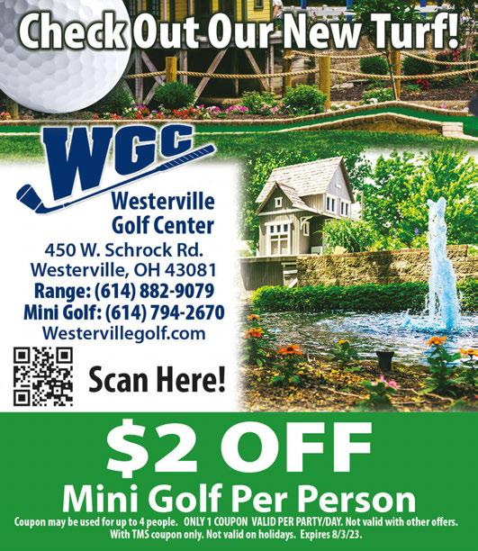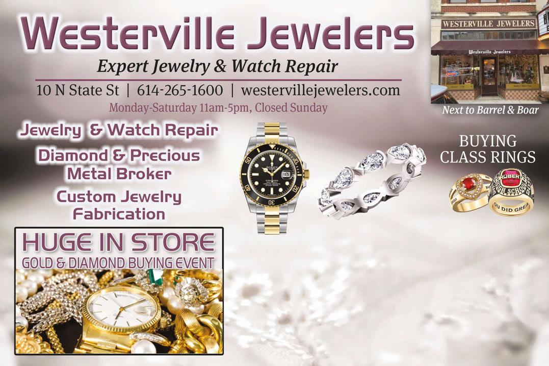 To advertise call: 614.679.8160 Town Money Saver Coupon savings from your favorite neighborhood businesses 44 N. State Street Westerville, OH 43081 614-823-8800 www.atwistonolives.com • Extra Virgin Olive Oil • Balsamic Vinegars • Specialty Vinegars • Gift Baskets A TWIST ON OLIVES FREE Bottle of Oil or Vinegar (60ml) With any purchase of $25 or more. (Excludes Specialty Oils) Must present coupon at time of purchase. 1 coupon per customer. ot valid with any other offer or discount. Expires 8/3/23. Hours: Tues-Sat 11a-5p 16 E. College Ave Westerville, OH 43081 614-899-6110 www.mycousinscottage.com • Home Decor • Furniture • Kitchen Goods Hours: Mon-Sat 11am-6pm; Sun 1pm-5pm $5.00 OFF ANY PURCHASE OF$25 OR MORE Must present coupon. Cannot be combined with any other offer or discount. Expires 8/3/23. My Cousin’s Cottage 30 N. State Street Westerville, OH 43081 614-882-1015 www.ohioartmarket.com • Jewelry • Ceramics • Skin Care • Home Decor • Toys • Clothing • Edibles • Pets Hours: : Mon-Wed 10am-6pm, Thurs-Sat 10am-8pm Sun 11am-6pm Ohio Art Market Presenting Ohio Handmade Ohio Artists & Artisans 8 E. Main Street Westerville, OH 43081 614-895-7420 www.uptownwesterville.us/ grandfatherclockcompany/ • Antiques • Collectibles • Vintage, Antique & New Clocks Grandfather Clock Company