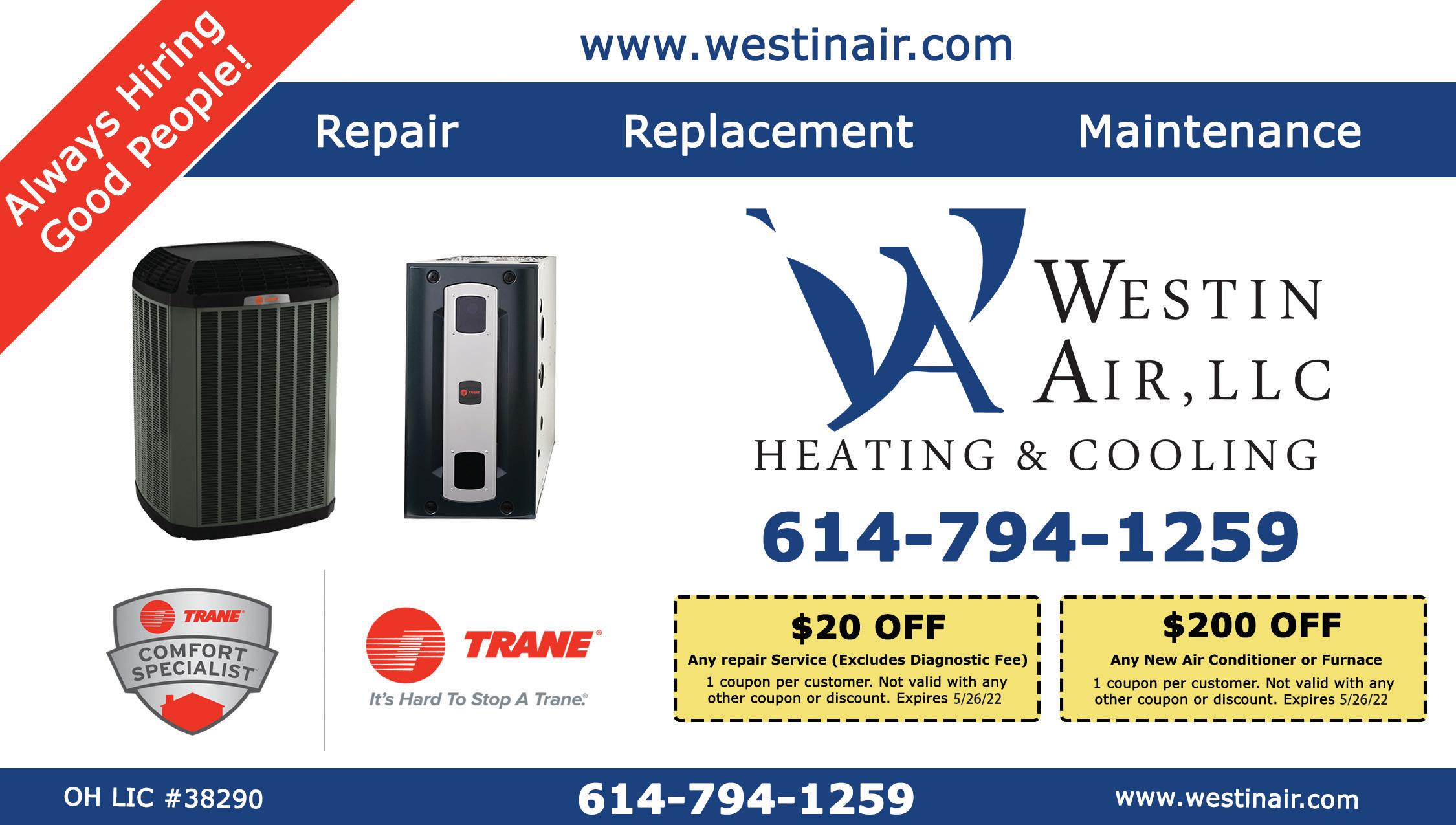 website: www.westervilleair.com 614 - 957 - 7785 RSD-322-7 RSD-322-8 RSD-322-5 RSD-322-6 with any completed paid repair 80% E ciency, up to 60k BTU. 13 SEER, up to 2 Ton. Permits not included. Code update not included. Not valid with other o ers or discounts. Must have existing air conditioner. Some restrictions may apply. Expires 5/24/22. 96% E ciency, up to 60k BTU. 13 SEER, up to 2 Ton. Permits not included. Code update not included. Not valid with other o ers or discounts. Valid for 90% to 90% replacement. Must have existing air conditioner. Some restrictions may apply. Expires 5/24/22. Must mention coupon with scheduling. Not valid with other o ers or discounts. Some restrictions may apply. Applies to HVAC services only. Expires 5/24/22. Must mention coupon with scheduling. Not valid with other o ers or discounts. Some restrictions may apply. Expires 5/13/22. 13 SEER, up to 2 Ton. Permits not included. Code update not included. Must mention coupon with scheduling. Not valid with other o ers or discounts. Must have existing air conditioner. Some restrictions may apply. Expires 5/24/22. 16 SEER, up to 2 Ton. Permits not included. Code update not included. Must mention coupon with scheduling. Not valid with other o ers or discounts. Must have existing air conditioner. Some restrictions may apply. Expires 5/24/22. must schedule before May 13 TANKLESS WATER HEATER FURNACE & AC 96% SUPER HIGH-EFFICIENCY 7,999 HIGH-EFFICIENCY FURNACE & AC 6,999 AC SPECIAL EARLY BIRD 16 SEER 3,999 EARLY BIRD 13 SEER AC SPECIAL 3,499 Up to 180k BTU. Call for Conditions and Restrictions. Cannot be combined with any other o er. Expires 5/24/22. 3,499 WATER HEATER Up to 30 gallons. Call for Conditions and Restrictions. Cannot be combined with any other o er. Expires 5/24/22. 1,450 CERTIFIED 5.0 Rated BUSINESS