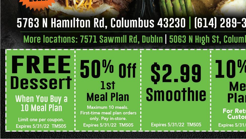16 E. College Ave, Westerville (614) 899-6110 Refresh Your Home! $5 Off Any Purchase of $25 or More Must present coupon. Cannot be combined with any other coupons. Expires 5/26/22. Shop Facebook & www.mycousinscottage.com D SHOE REPAIR 16 W. College Ave. (Behind Graters Ice Cream) 614-891-2395 NOW CARRYING Pop, Water, Candy & Snacks! Central Ohio’s #1 Clock Shop Sales & Service Download the ALL NEW app today. Carry the great savings from the pages of Town Money Saver® in the palm of your hand. New look. New features. New ways to save on the go. Shop locally. Save locally. 15% OFF Sterling Silver Pendants & Chains Expires 5/26/22. Captivating Canines Captivating Canines 12 East Main St, Westerville OH 882-8863 captivating-canines.com DELIVERY AVAILABLE www.facebook.com/CaptivatingCanines/ Harness Fitting & Trial Walks Available Distinctive Gifts for Dog & Cat Lovers Treats, Toys, Pet Memorial Memorabilia, Dog & Cat Food, & Much More! See Us For ALL Your Mother’s Day Gift Ideas! WWW.LACLEANERS.COM 50% OFF Dry Cleaning (1st Time Customers & Clothing Items Only) 10% OFF Any Dry Cleaning (Existing Customers) Any Size Comforter $25 Any Size Area Rug Must present coupon with incoming order. Does not include Household Items, Leather, Suede or Wedding Gowns. Expires 5/26/22. WEST Must present coupon with incoming order. Does not include Alterations, Leather, Suede or Wedding gowns. Expires 5/26/22. WEST Must present coupon with incoming order. Expires 5/26/22. WEST FREE pickup & Delivery. Must present coupon with incoming order. Expires 5/26/22. WEST 614-882-2995 6113 Maxtown Rd., Westerville, OH 43082 (In Back) PER SQ FT ($2.50 per sq ft if there is fringe) $2 Free Pickup & Delivery