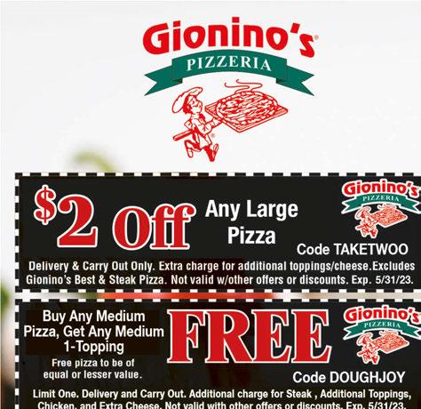 MONDAY - $7.95 Spaghetti Dinner with Meatball TUESDAY - $12.50 Large 1 Item Pizza* (Avail. for Carryout) WEDNESDAY - $12.00 Meat Lasagna Dinner THURSDAY - $12.95 Chicken Parmesan Dinner Spaghetti OR Ziti Dinner with 4 meatballs, quart of salad & dinner rolls $19.95 $3 OFF $10 OFF $5 OFF (Carry-Out Only) (Dine-In or Carry-Out) (Dine-In or Carry-Out) (Dine-In or Carry-Out) Family Pasta Dinner Minico’sMinico’s Minico’s Minico’s Any Large Pizza $50 Purchase $25 Purchase Not valid with any other offers. Expires 6/1/23.Not valid with any other offers. Expires 6/1/23. Not valid with any other offers. Expires 6/1/23. Not valid with any other offers. Expires 6/1/23. Daily Specials! DINING ROOM OPEN Wednesday ru Saturday 4pm-8pm