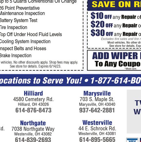 Westervi e Florist 14 South State St, Westerville, OH 43081 614-882-2000 • westervilleflorist.net Hours: Mon-Fri 11am-4pm Sat 10am-3pm, Sun Closed • Custom Floral Arrangements • Flower Subscriptions • Balloons, Buckeyes, Bears & More • Gift Certificates $10 Off PREORDER NOW For Mother’s Day Delivery Deadline is 5/10/23. Any Purchase of $60 or more Must present a coupon at time of purchase. Expires 6/1/23. Online code: WTMS23 • Custom Design Bridal Dresses • Bridal Alterations • Everyday Alterations • Embroidery bridal_designsby_ephallis 670 Meridian Way - Suite #260 Westerville, Ohio 43082 DesignsbyE2020@gmail.com Call For Appointment 614-282-7175 16 E. College Ave Westerville, OH 43081 614-899-6110 www.mycousinscottage.com • Home Decor • Furniture • Kitchen Goods Hours: Mon-Sat 11am-6pm; Sun 1pm-5pm My Cousin’s Cottage $5.00 OFF ANY PURCHASE OF $25 OR MORE Must present coupon. Cannot be combined with any other offer or discount. Expires 6/1/23. Call Today About Our Specialty Page & How to Reserve Your 1/9 Page Ad For Junes Issue Before They Are Gone! Call Sharon Today to get Started 614-679-8160 sharonziegler@townmoneysaver.com Shop Locally Word Search Contest Winner $100.00 Hoover Gardens Gift Card Alison Mumford