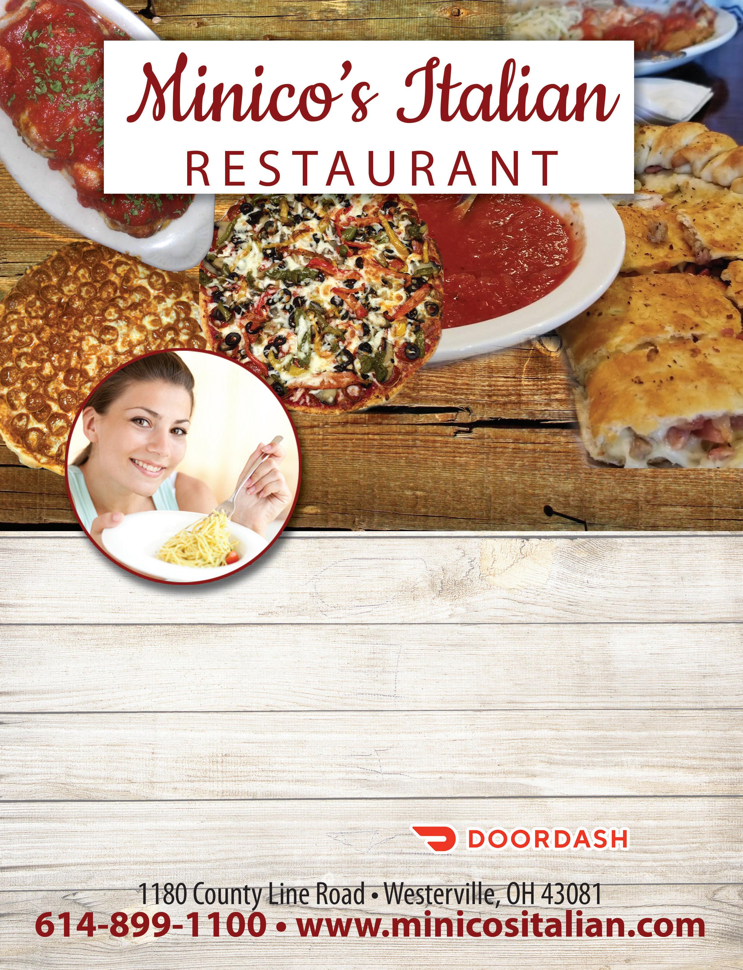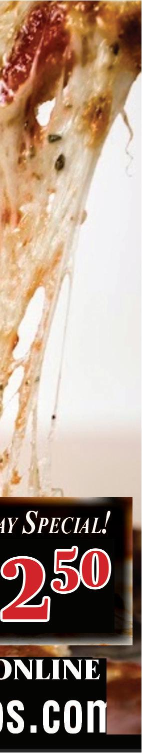 MONDAY - $7.95 Spaghetti Dinner with Meatball TUESDAY - $12.50 Large 1 Item Pizza* (Avail. for Carryout) WEDNESDAY - $11.50 Meat Lasagna Dinner THURSDAY - $12.00 Chicken or Veal Parmesan Dinner Spaghetti OR Ziti Dinner with 4 meatballs, quart of salad & dinner rolls $19.95 $3 OFF $10 OFF $5 OFF (Carry-Out Only) (Dine-In or Carry-Out) (Dine-In or Carry-Out) (Dine-In or Carry-Out) Family Pasta Dinner Minico’s Minico’s Minico’s Minico’s Any Large Pizza $50 Purchase $25 Purchase Not valid with any other offers. Expires 10/27/22. Not valid with any other offers. Expires 10/27/22. Not valid with any other offers. Expires 10/27/22. Not valid with any other offers. Expires 10/27/22. Daily Specials! DINING ROOM OPEN Tuesday Thru Saturday 4pm-8pm
