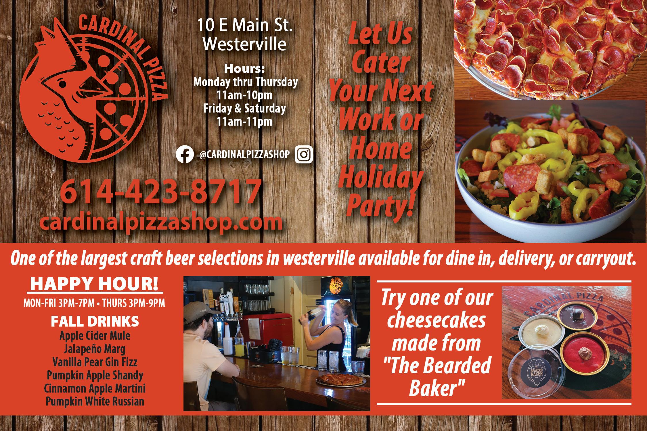 To advertise call: 614.679.8160 Town Money Saver Coupon savings from your favorite neighborhood businesses Save Locally 20 N. State Street Westerville, OH 43081 614-423-8091 www.CindaLouShop.com Gift Items • Cards • T-Shirts Jewelry • Records • Framed Art ~ plus ~ Fun & Funky 60’s & 70’s Vintage Cinda Lou Hours: Tues-Thurs 12pm-7pm Fri 12pm-8pm, Sat 12pm-6pm, Sun 12pm-5pm WE BUY RECORDS 1091 Eastwind Drive Westerville, OH 43081 614-379-4276 1091eventspace@gmail.com www.thegatheringspace1091.com THE GATHERING SPACE @1901 Eastwind Versatile Event Venue • Versatile indoor & outdoor space for up to 50 guests. • Wood dance floor, mirrors, special lighting and built-in music system. • Large outdoor green space for games, bounce house or tent. • Parking lot adjacent to venue. • Great for birthday, anniversary, bridal, holiday parties and fitness classes. BOOK YOUR RESERVATION TODAY! Hours Mon-Sat 12pm - 8pm & Sun 4pm-8pm 20 S. State St. Suite K Westerville, OH 43081 614-800-6422 www.dicarlospizza.com ORIGINAL Di Carlo’s FAMOUS PIZZA THE RIA ROOM